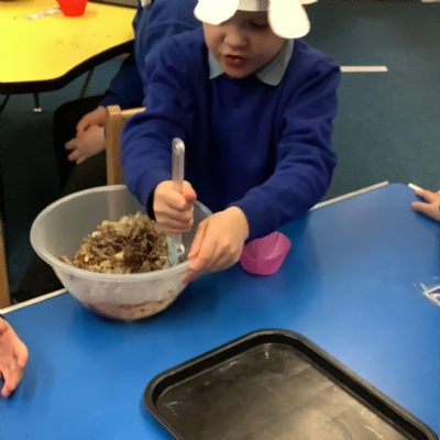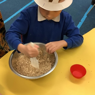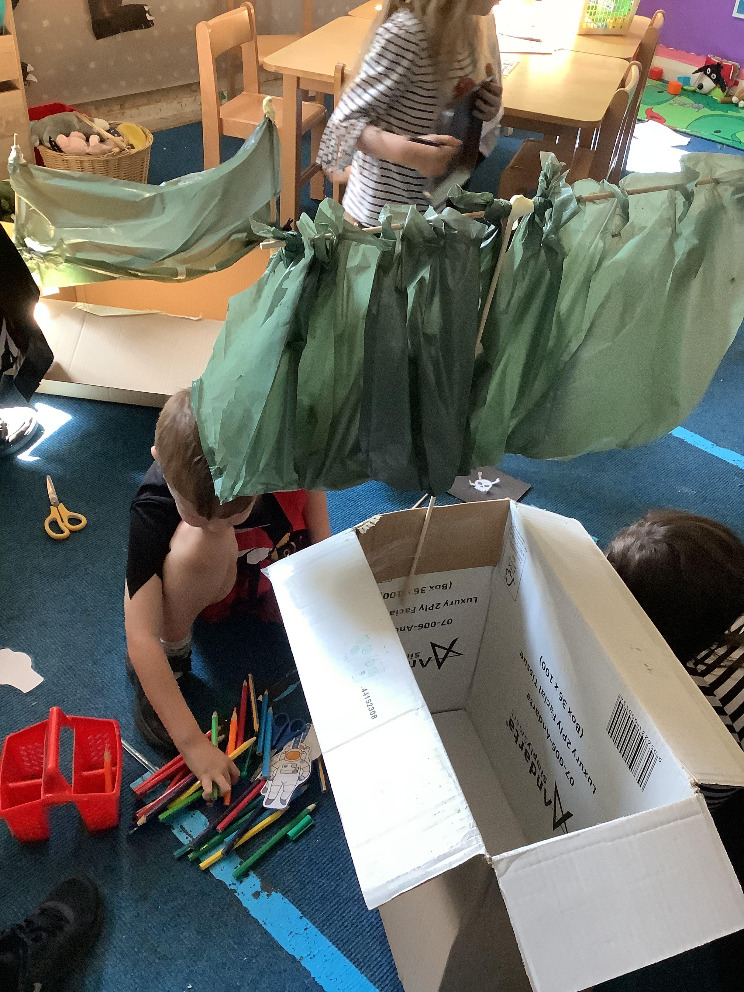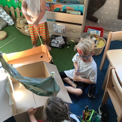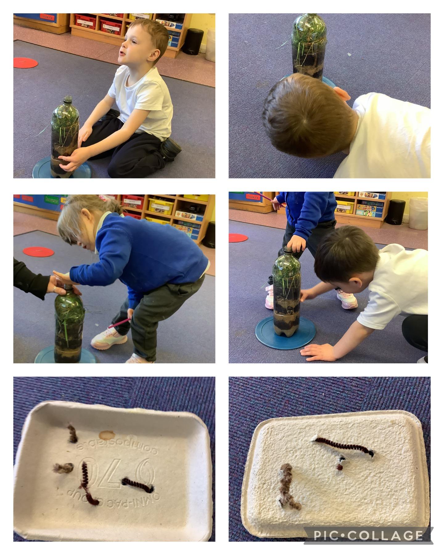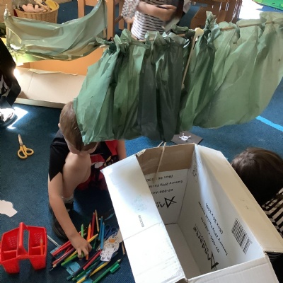 During forest schools the children made a wormery using an old plastic bottle, some soil and some sand. They then added some grass cuttings and some worms so that they could make observations over time. We wrapped the bottle with black paper to make it dark like it is underground. The children loved to see how the worms had mixed up the soil and the sand and pulled down the grass cuttings further into the bottle. This is what worms do in the garden. They help carry decaying material into the soil, where it is broken down by microorganisms into nutrients that can be used by plants to grow. The children used box modelling resources to show worms popping through the soil.