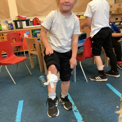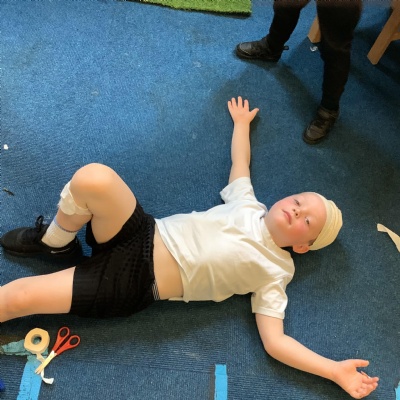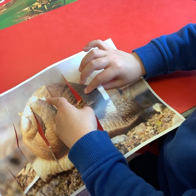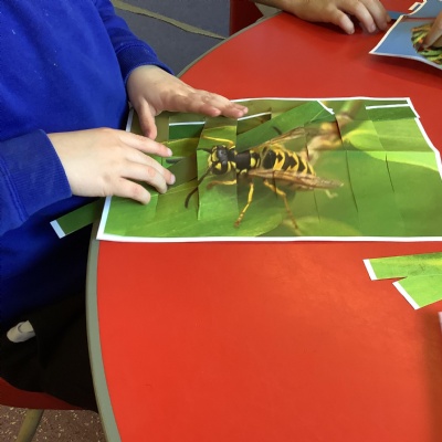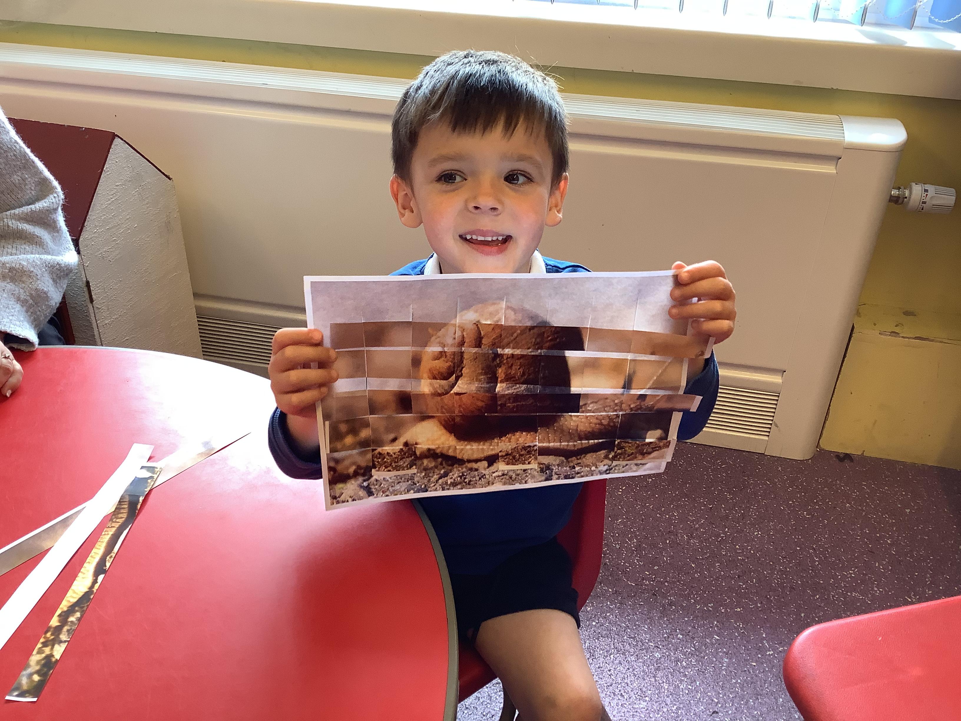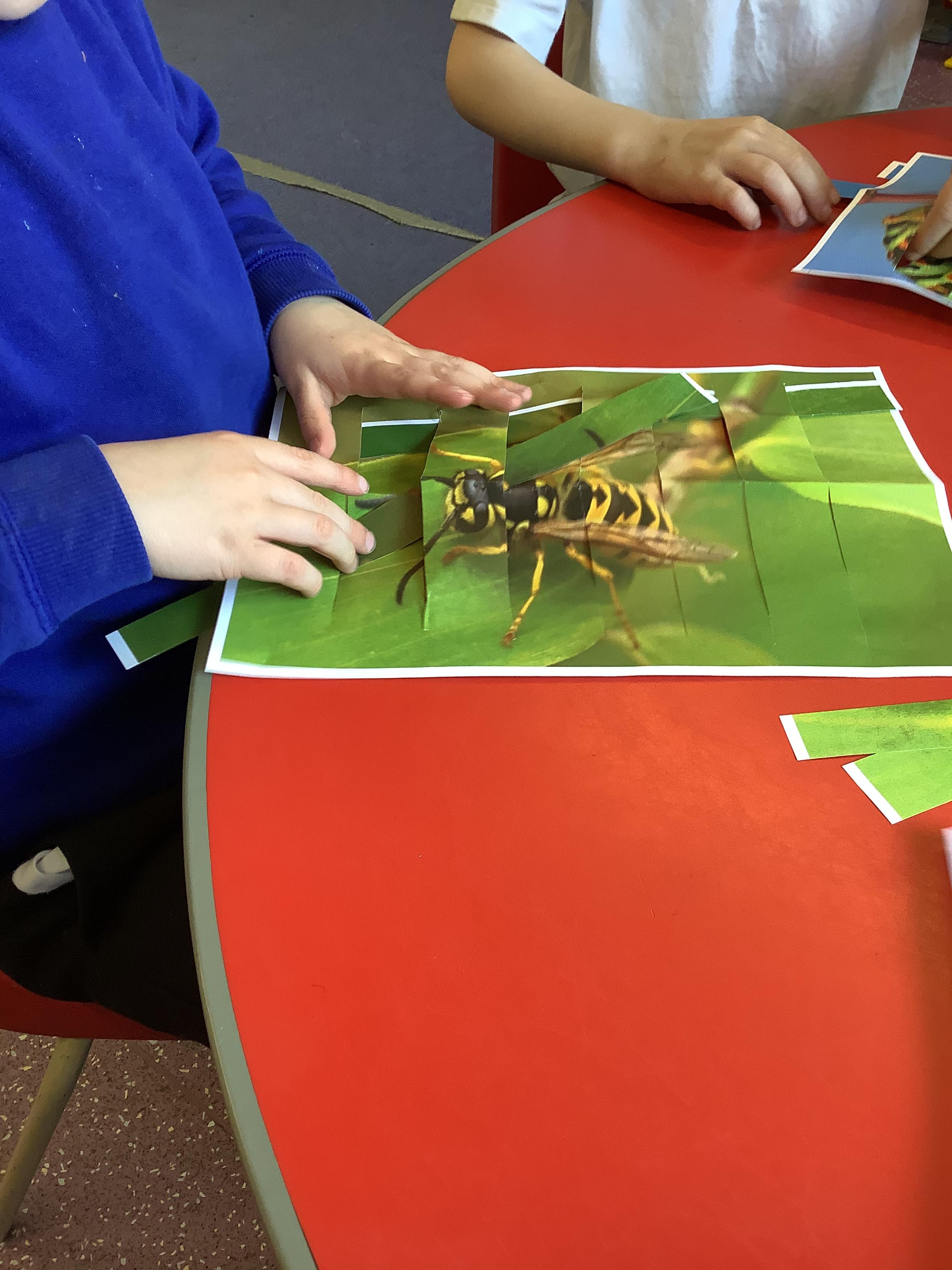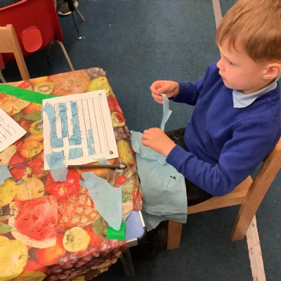 During forest schools the children made a wormery using an old plastic bottle, some soil and some sand. They then added some grass cuttings and some worms so that they could make observations over time. We wrapped the bottle with black paper to make it dark like it is underground. The children loved to see how the worms had mixed up the soil and the sand and pulled down the grass cuttings further into the bottle. This is what worms do in the garden. They help carry decaying material into the soil, where it is broken down by microorganisms into nutrients that can be used by plants to grow. The children used box modelling resources to show worms popping through the soil.