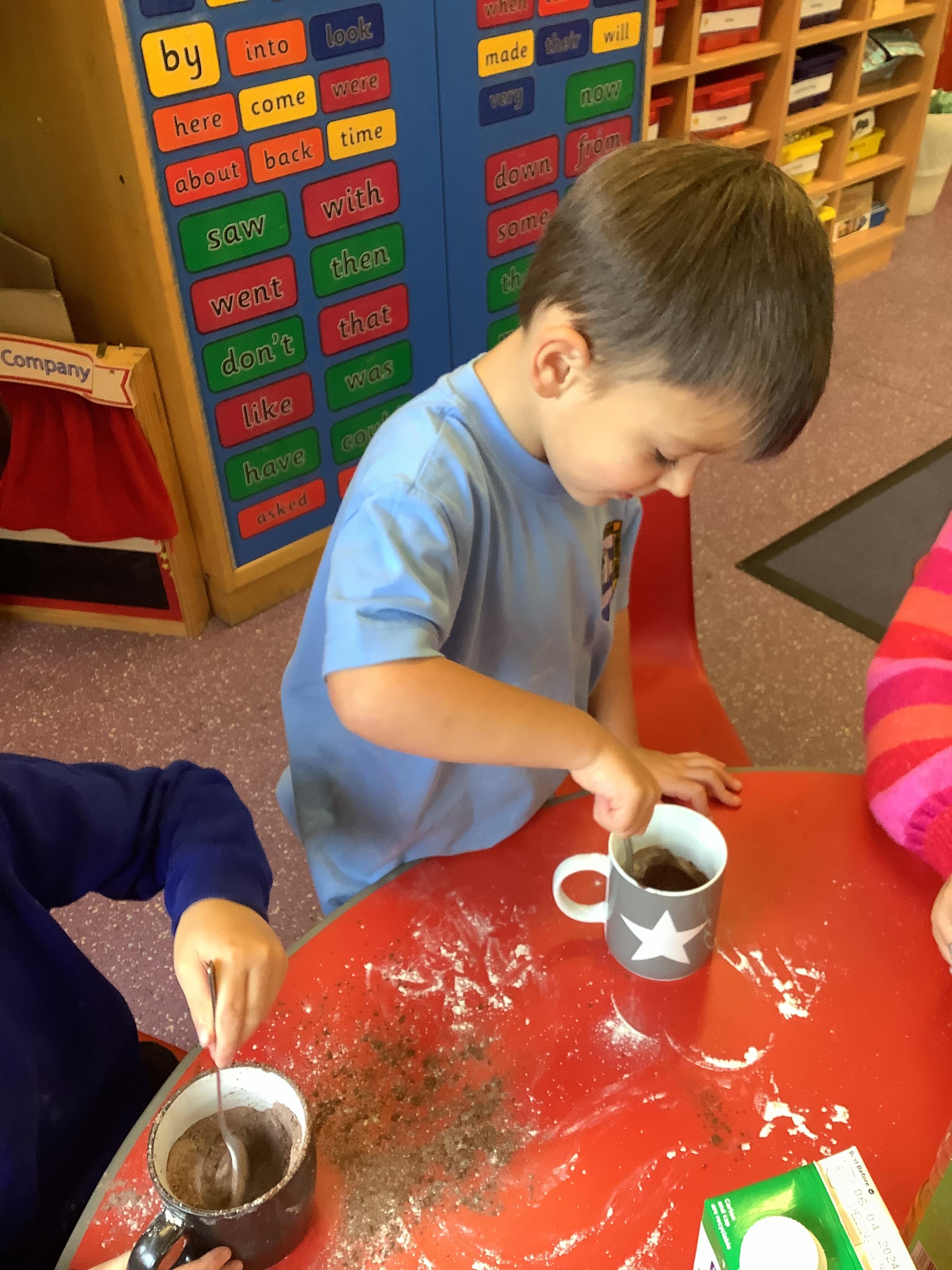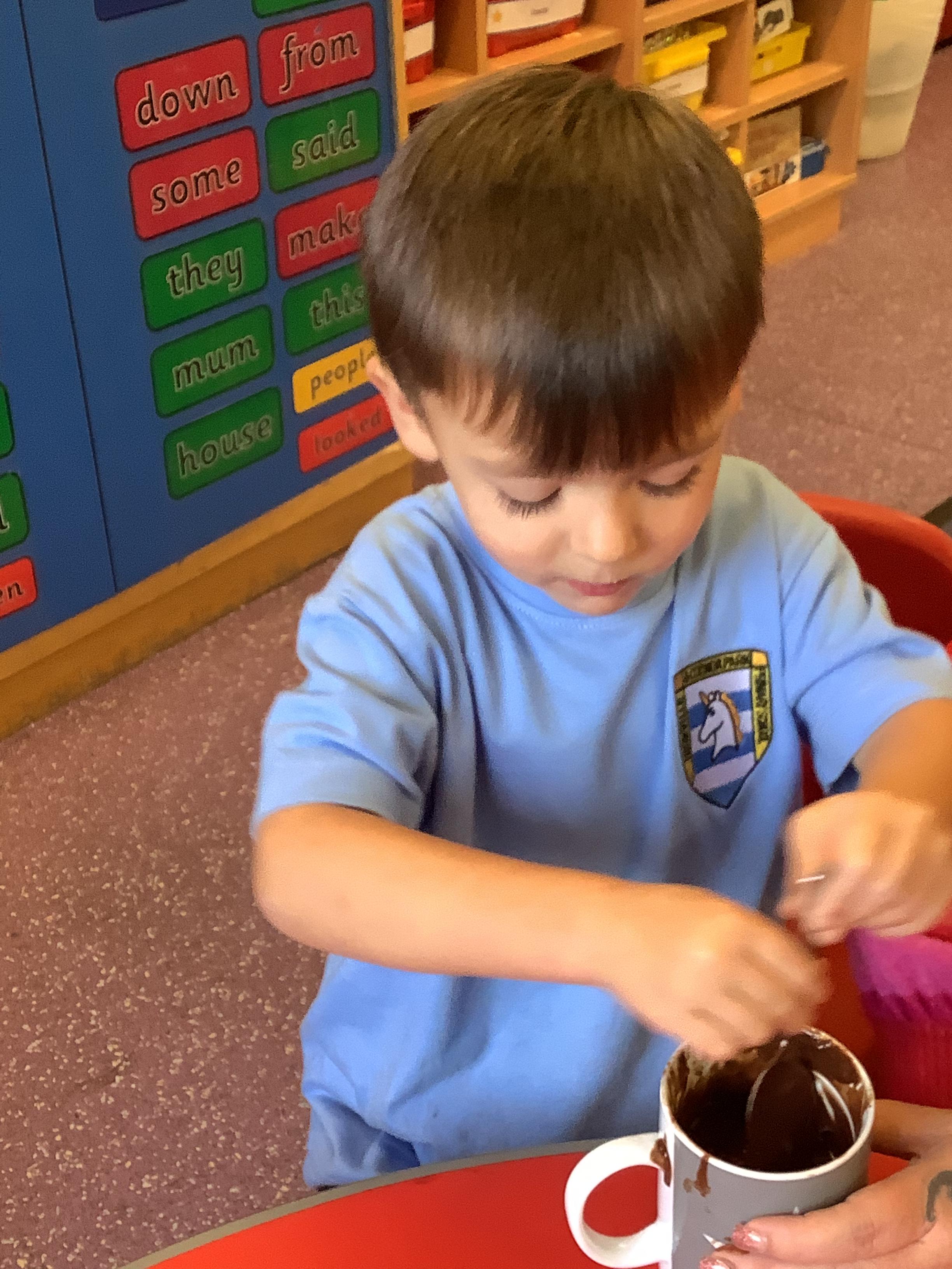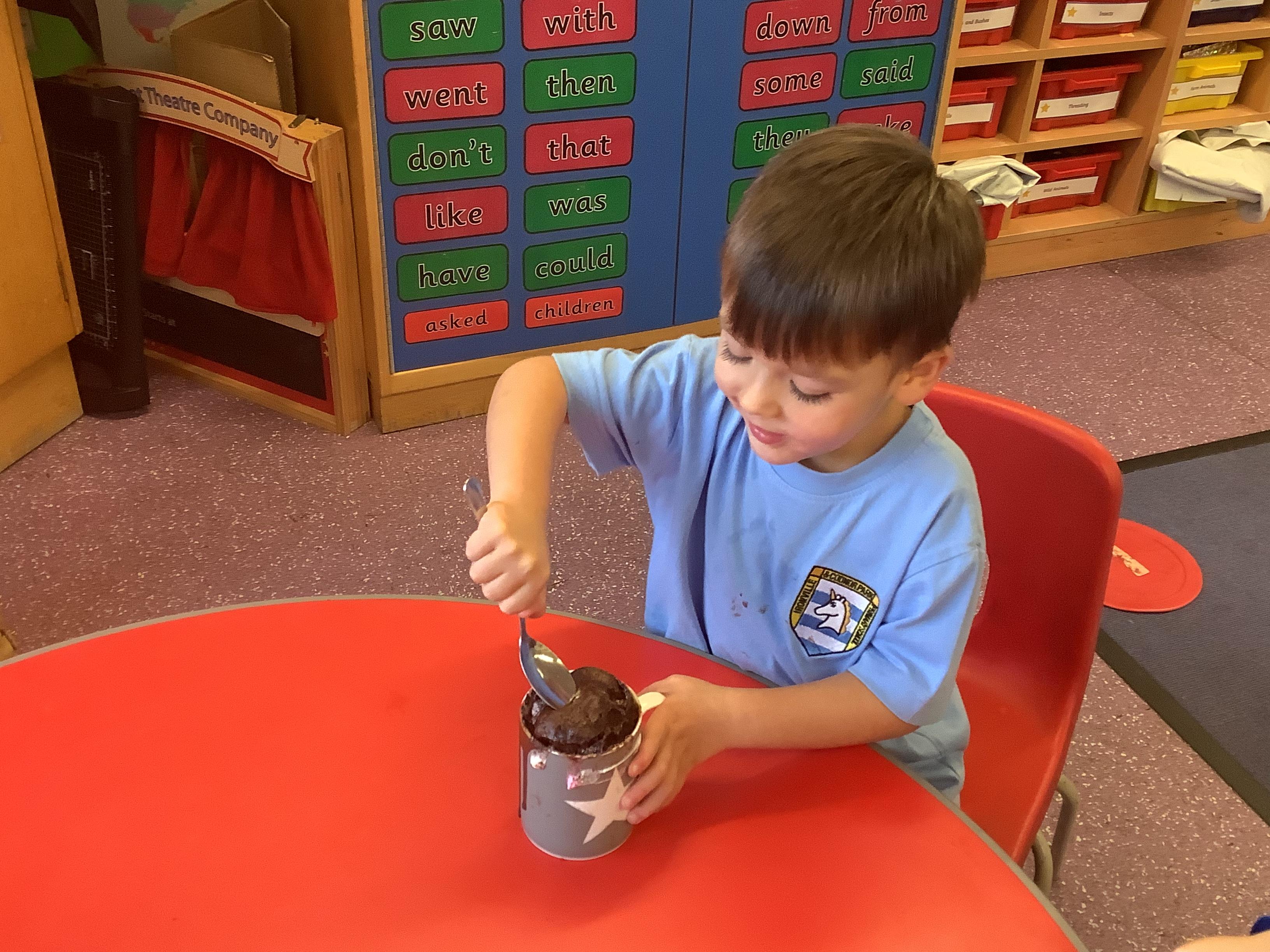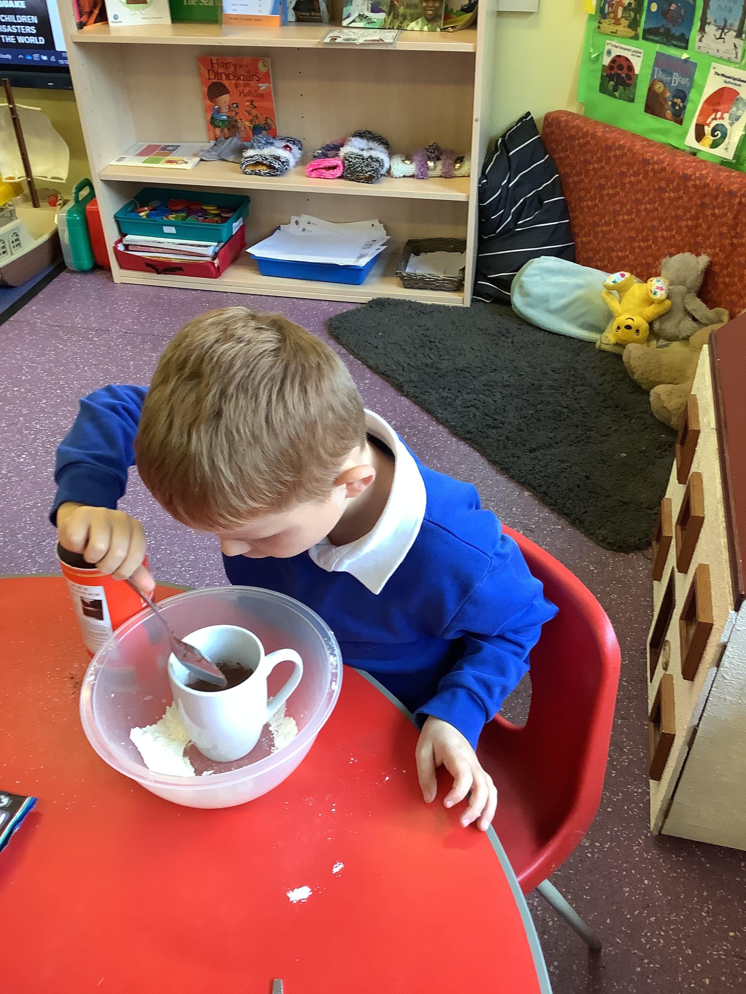 We followed instructions on how to make a chocolate mug cake as part of English experience day. We measured, we mixed, we poured and we added in our favourite sweet treats of chocolate chips, smarties and mini marshmallows. After they had finished cooking in the microwave, we let them cool before eating them. They were delicious!