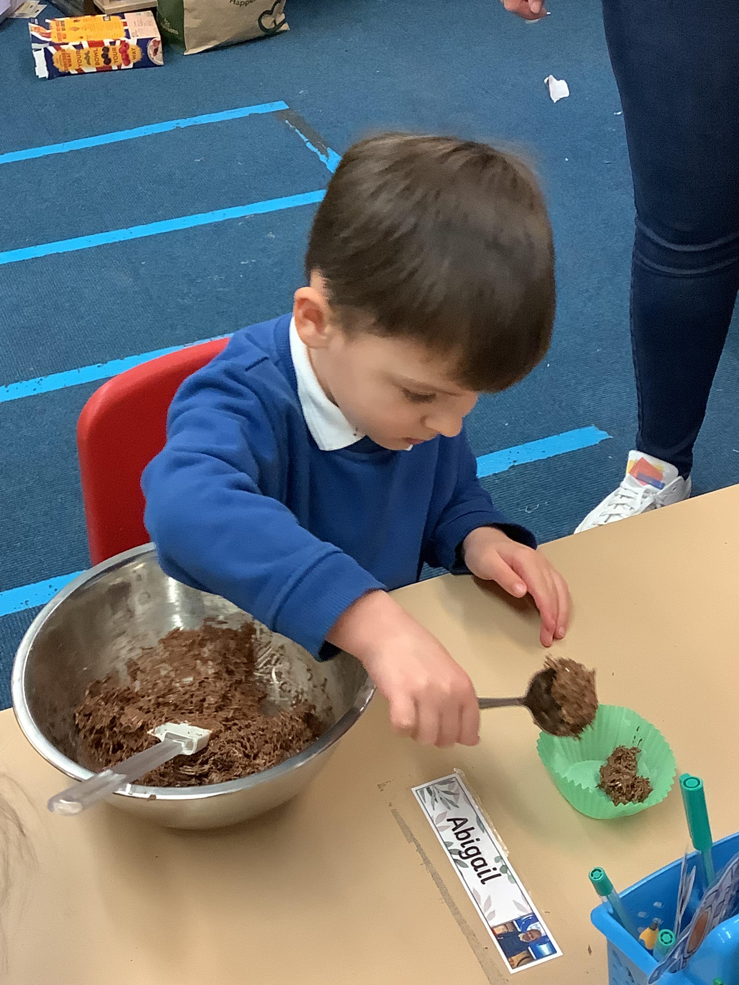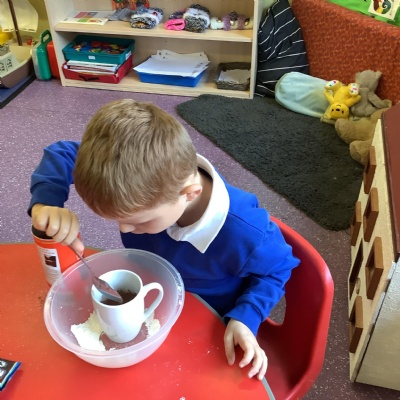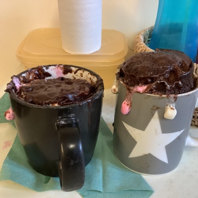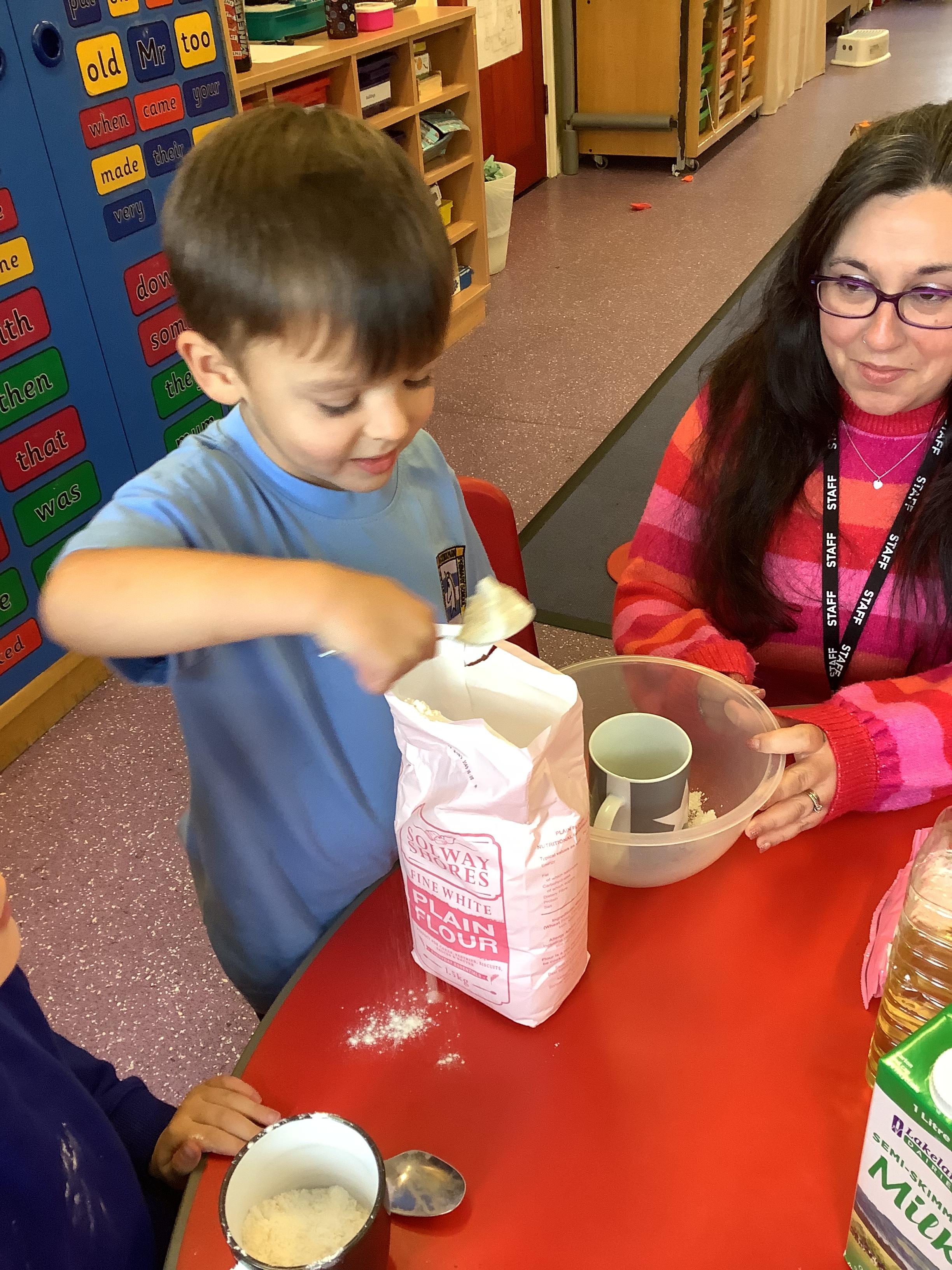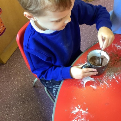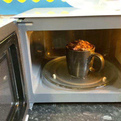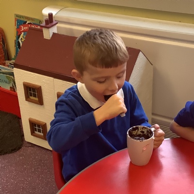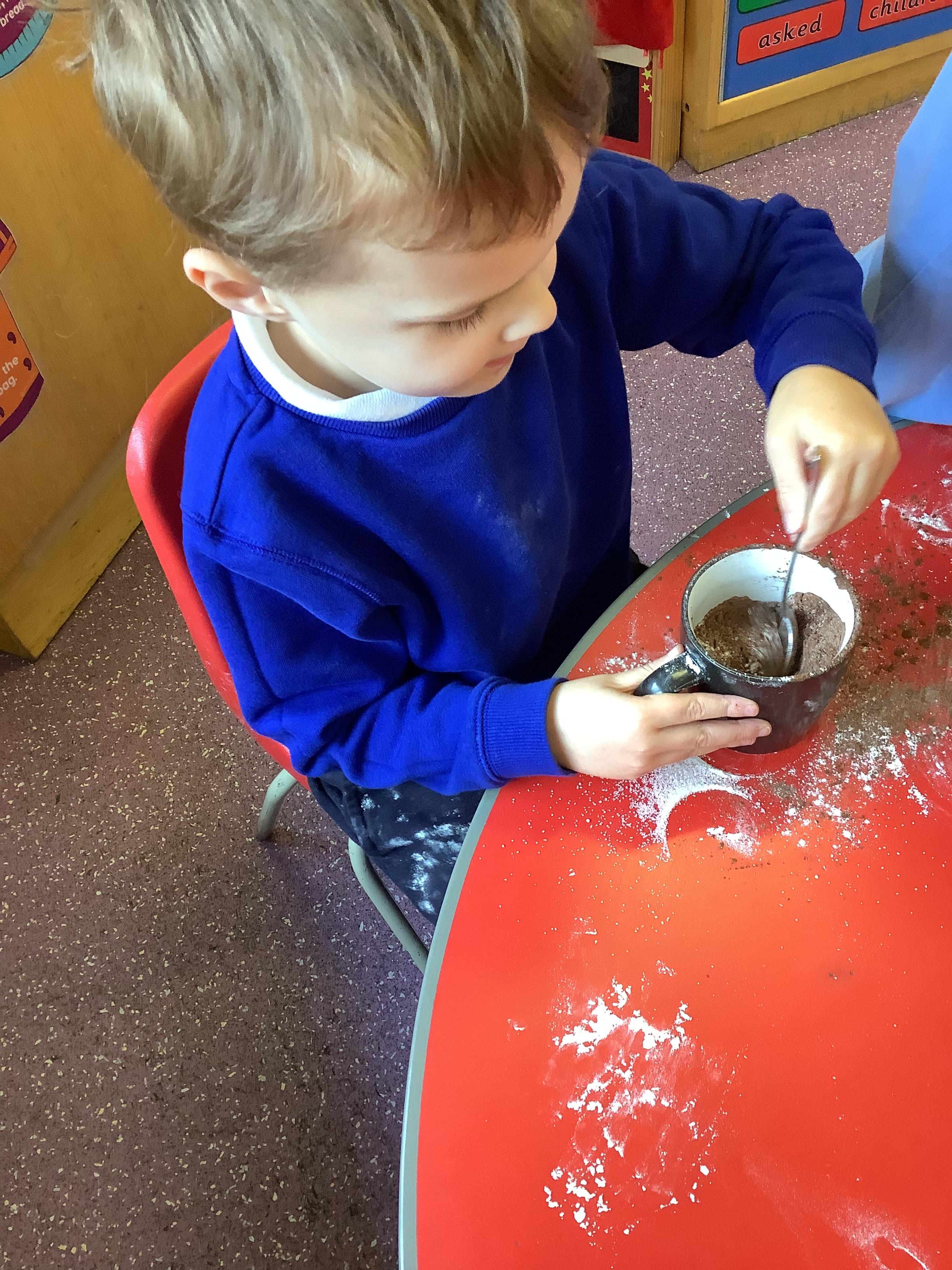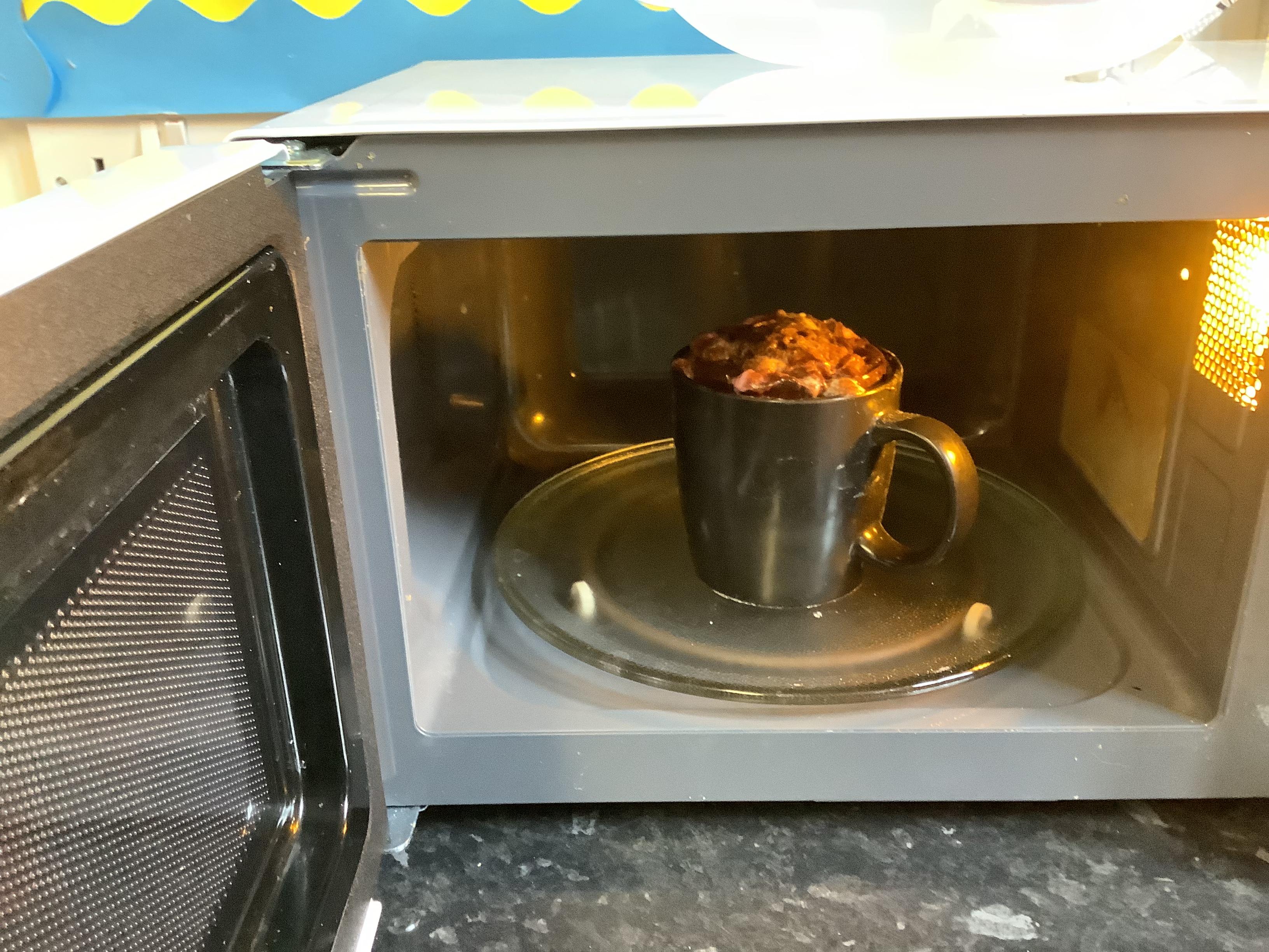 We followed instructions on how to make a chocolate mug cake as part of English experience day. We measured, we mixed, we poured and we added in our favourite sweet treats of chocolate chips, smarties and mini marshmallows. After they had finished cooking in the microwave, we let them cool before eating them. They were delicious!
