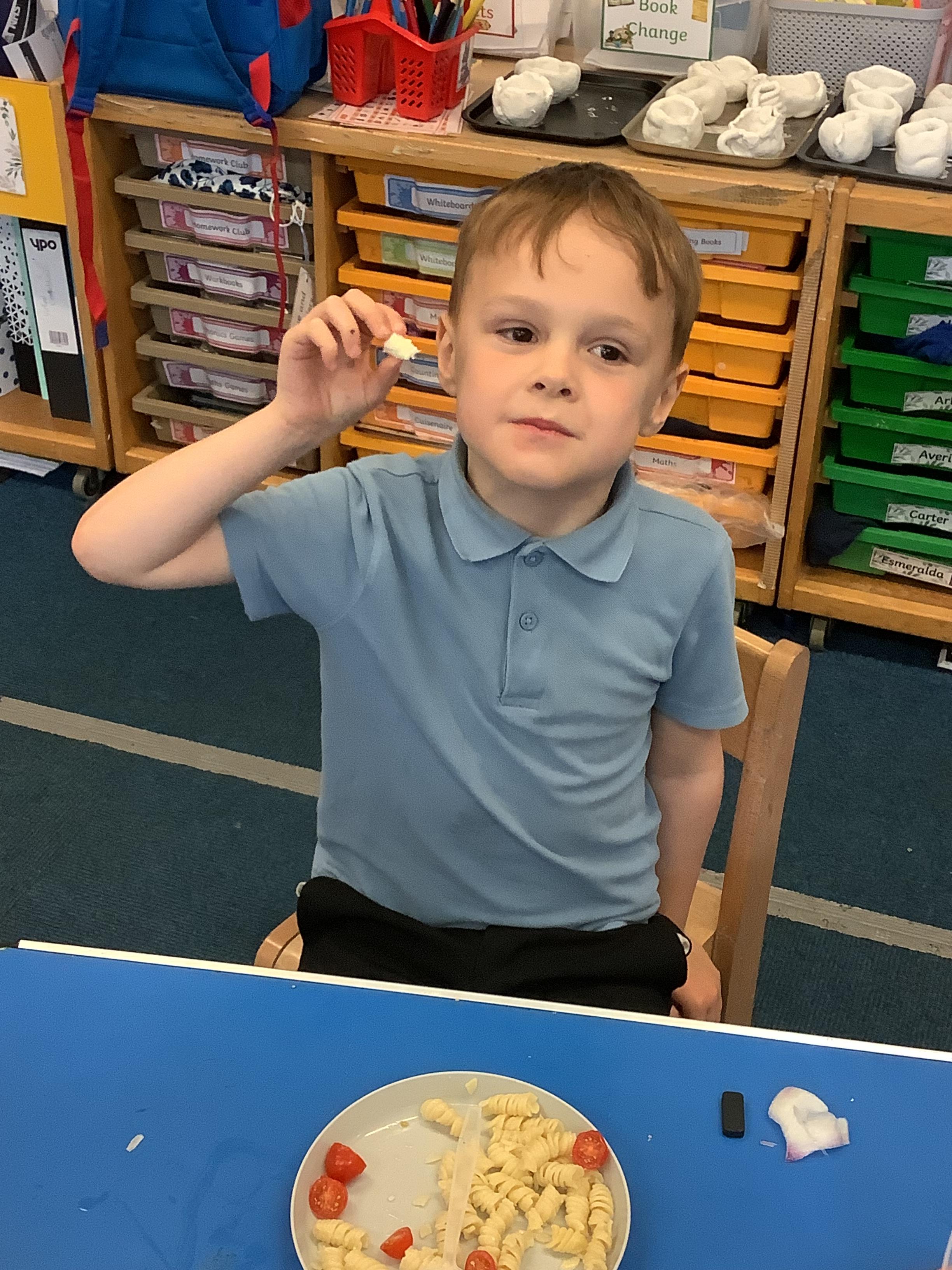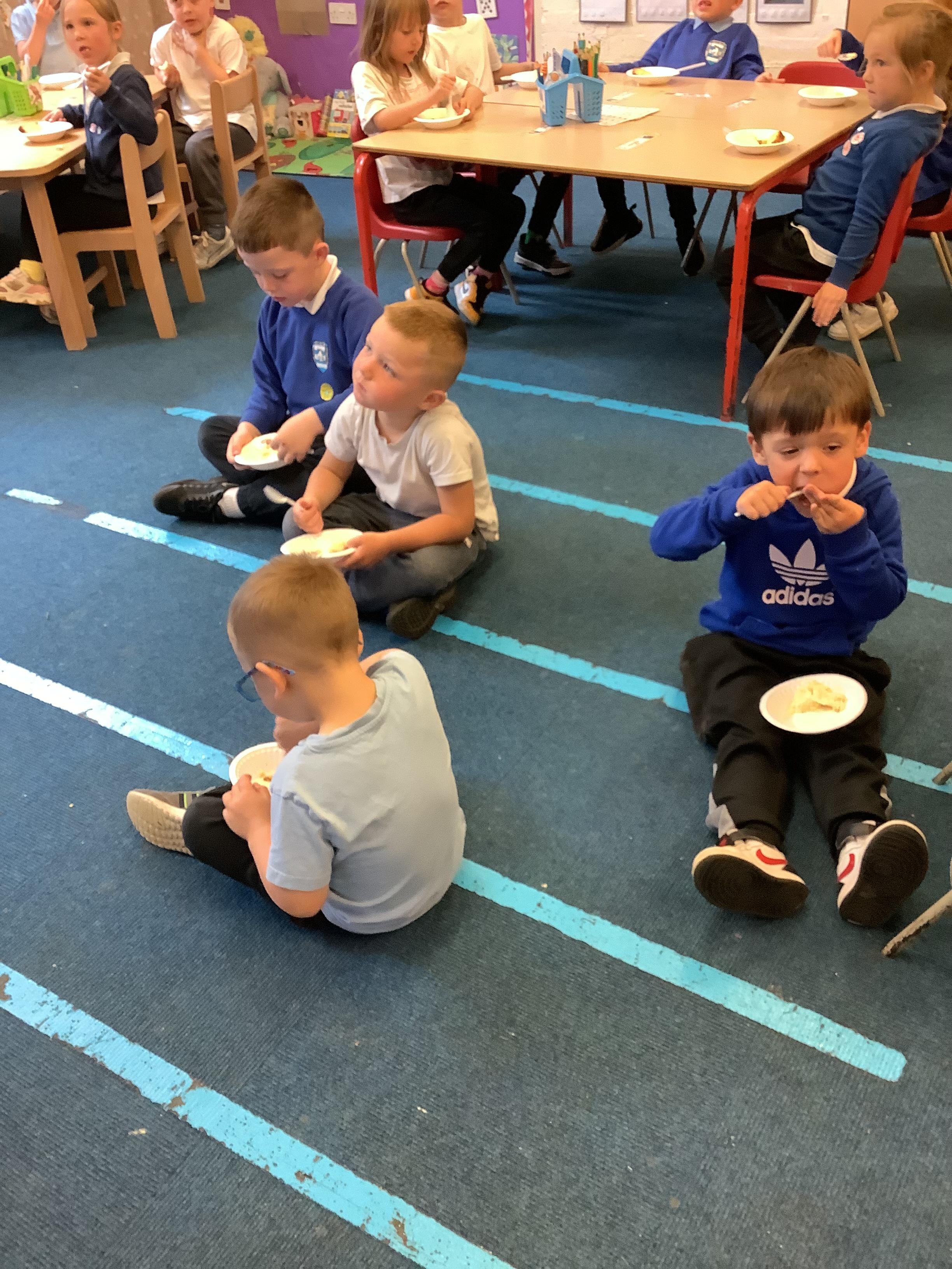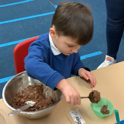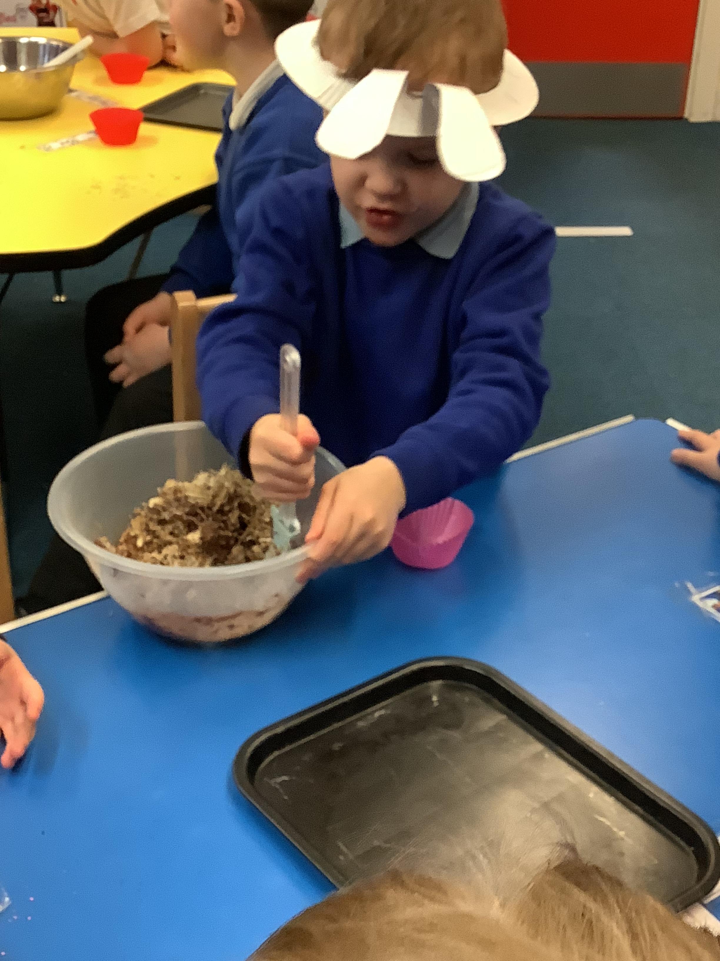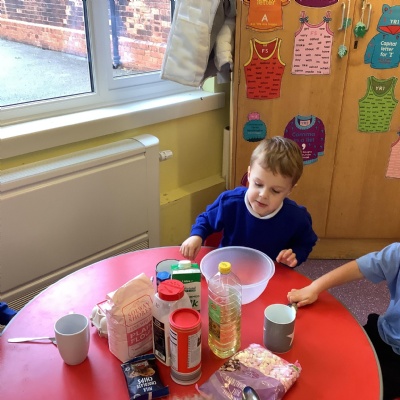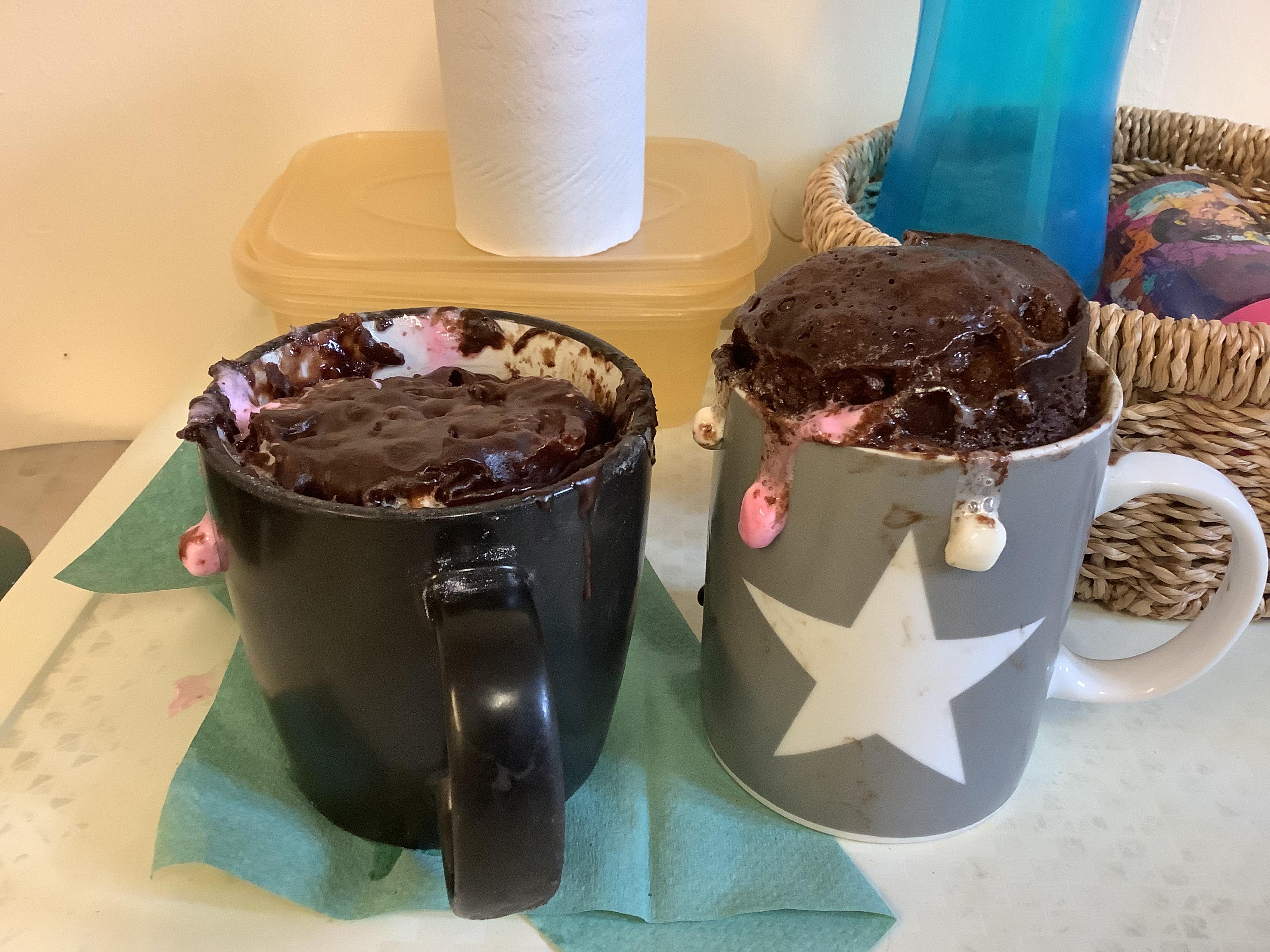 We followed instructions on how to make a chocolate mug cake as part of English experience day. We measured, we mixed, we poured and we added in our favourite sweet treats of chocolate chips, smarties and mini marshmallows. After they had finished cooking in the microwave, we let them cool before eating them. They were delicious!