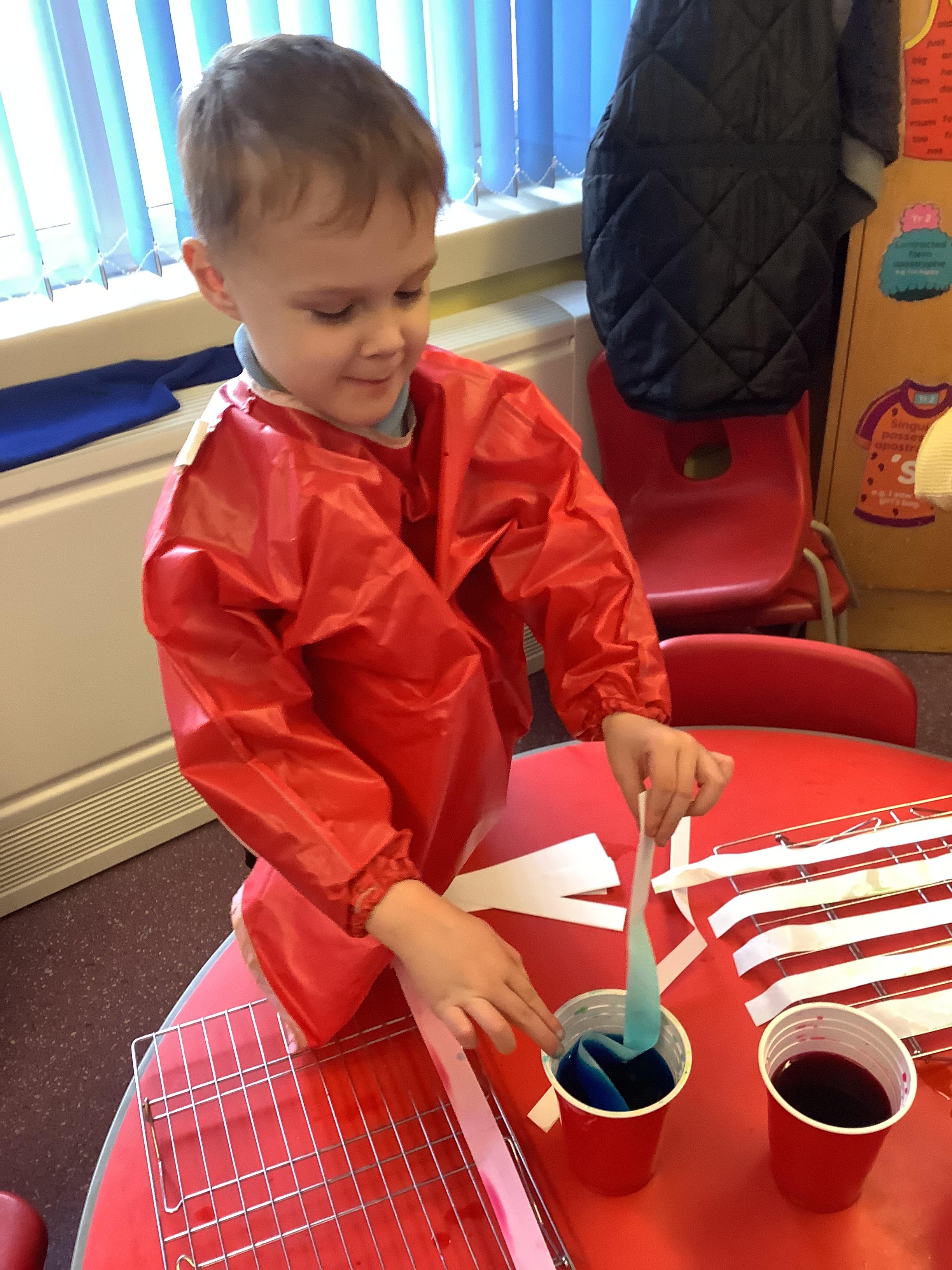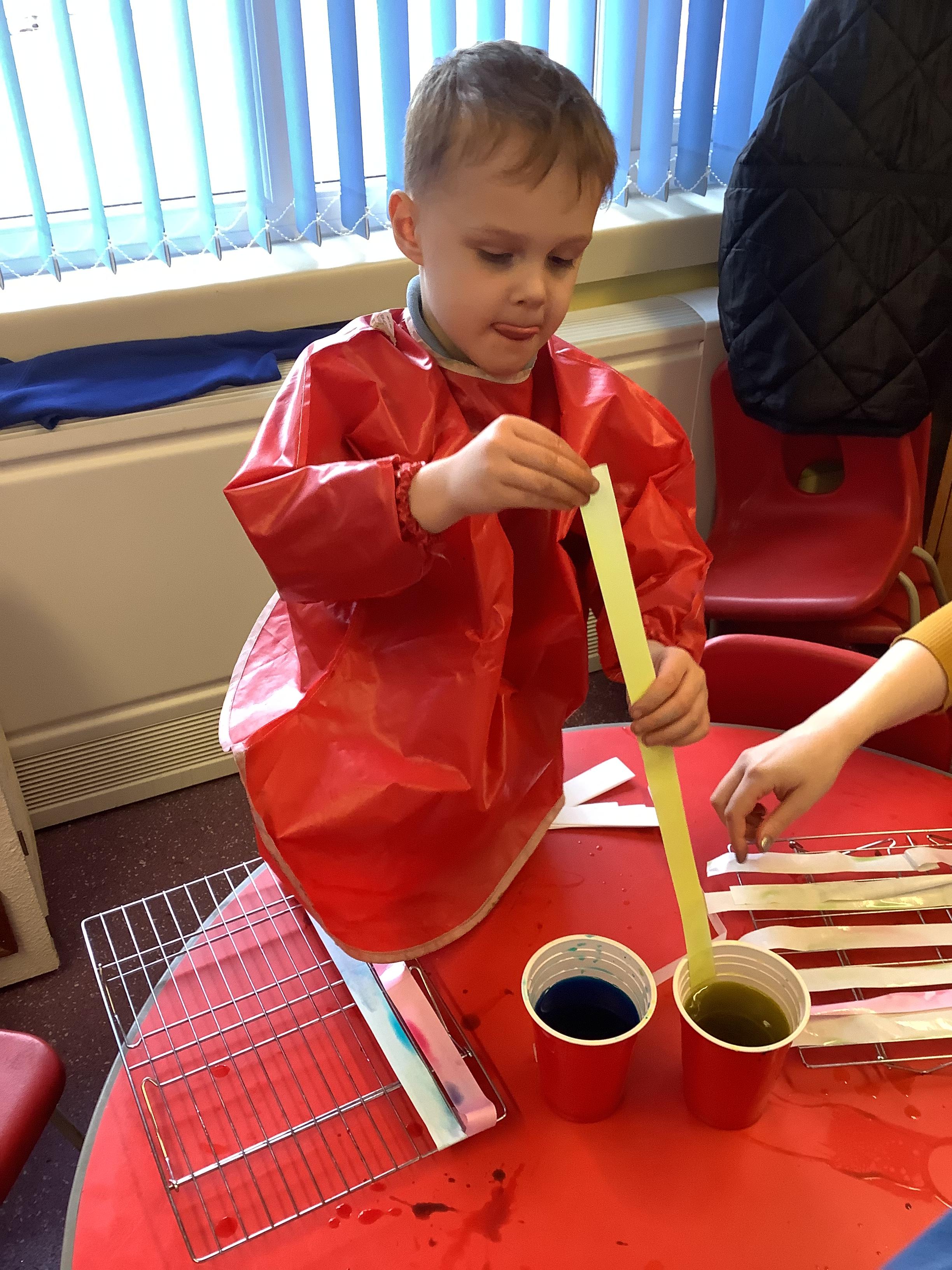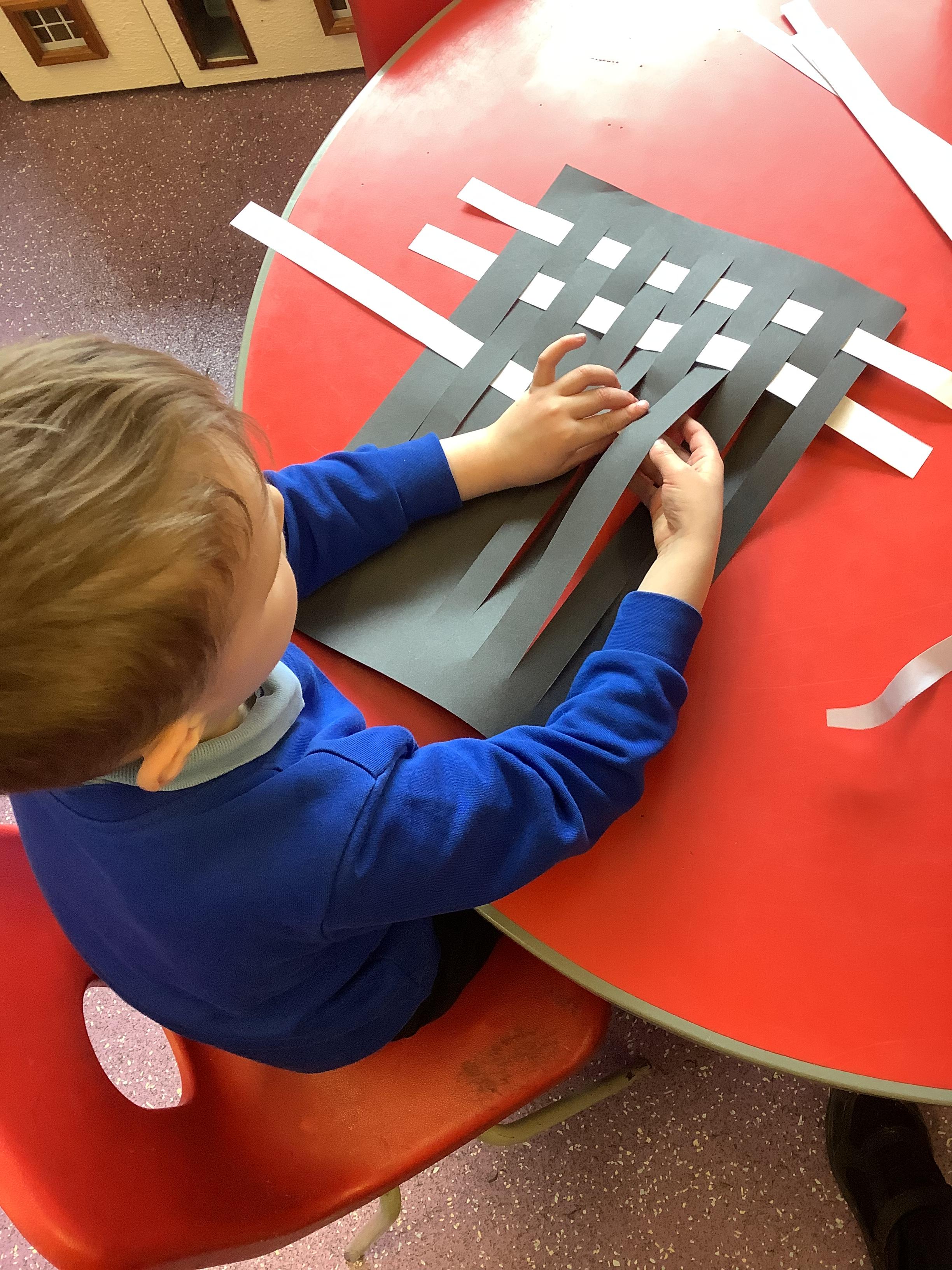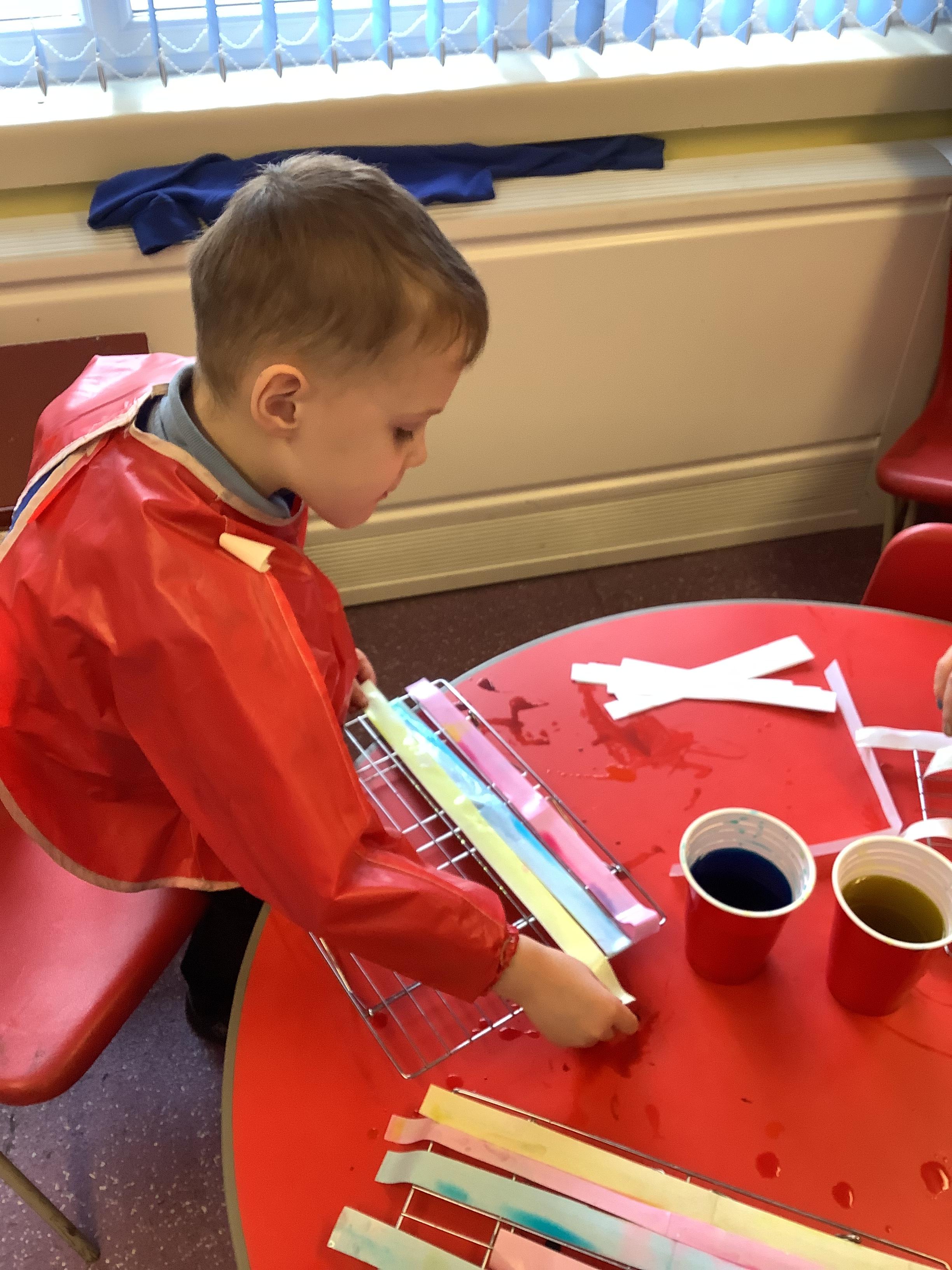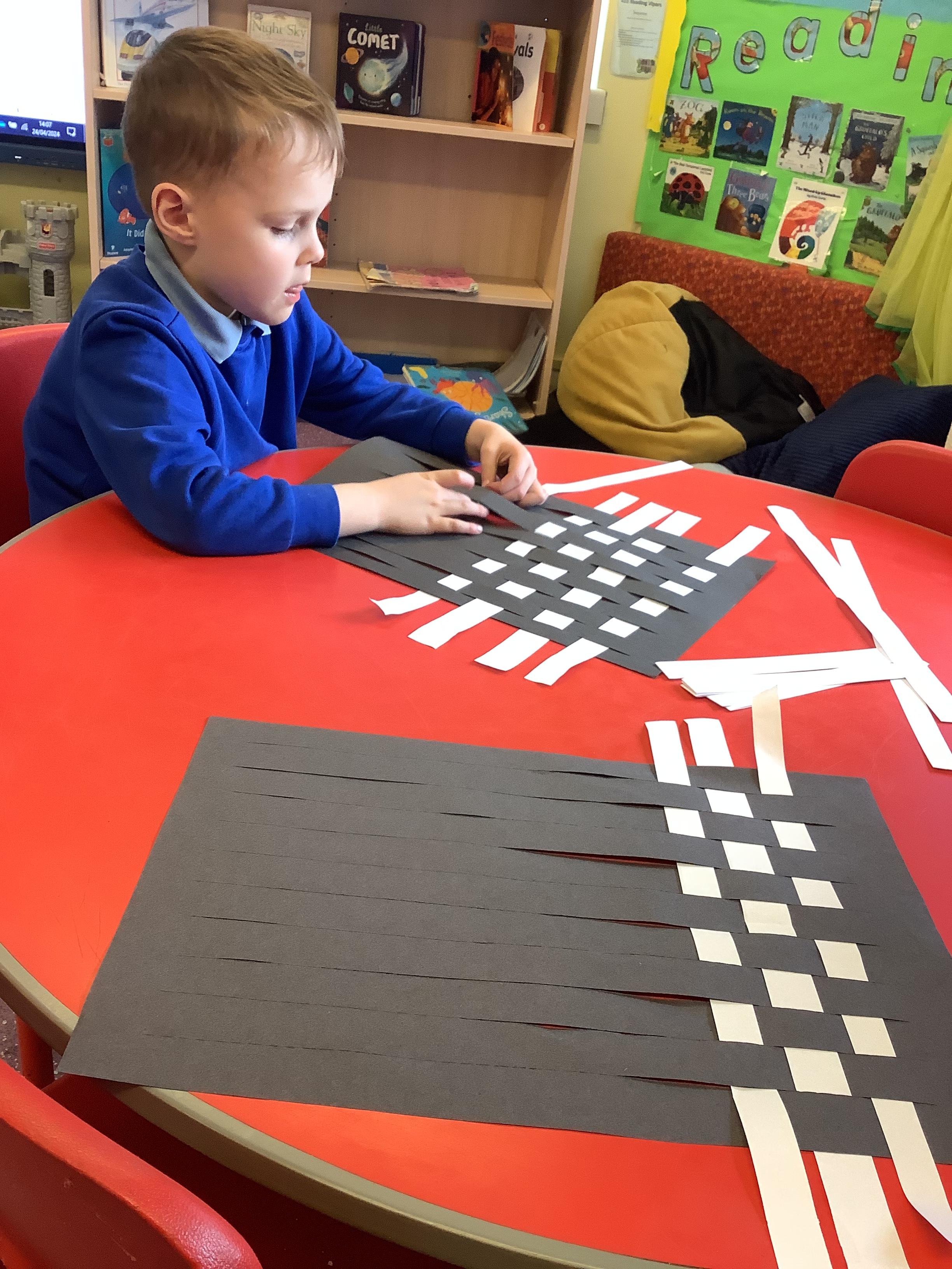 We have been paper weaving during our art lessons. The children enjoyed using the food colouring to dye the paper strip different colours and practiced the weaving method using thread first before practicing with paper.