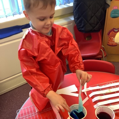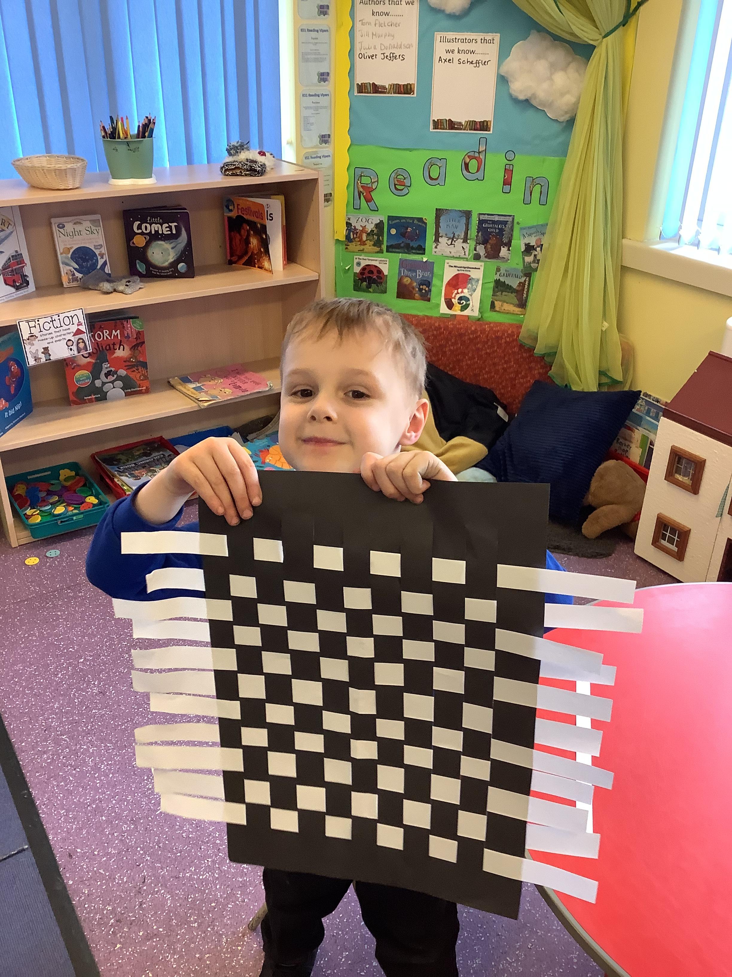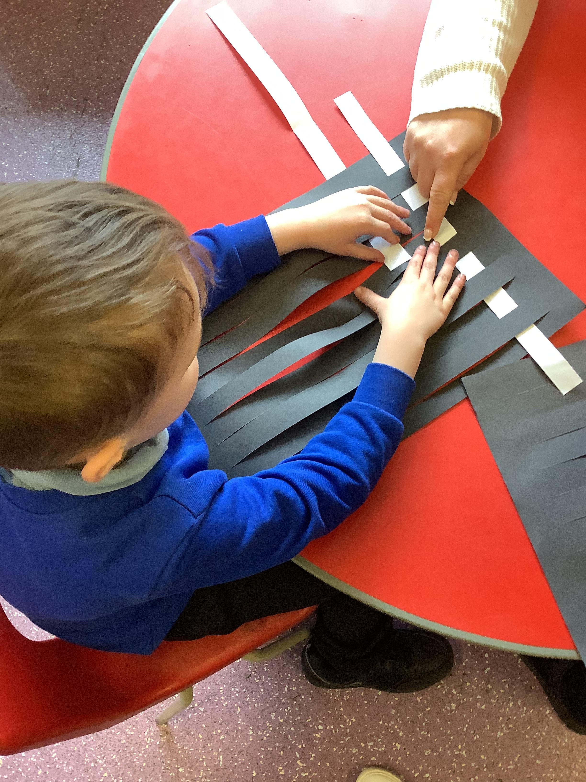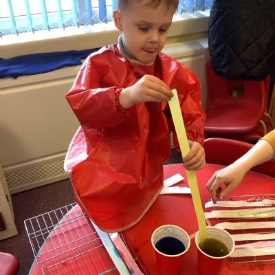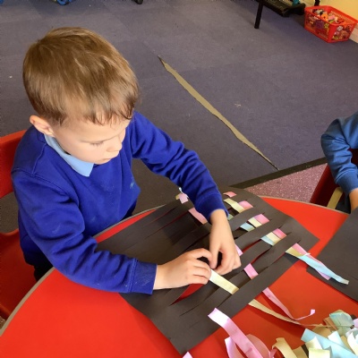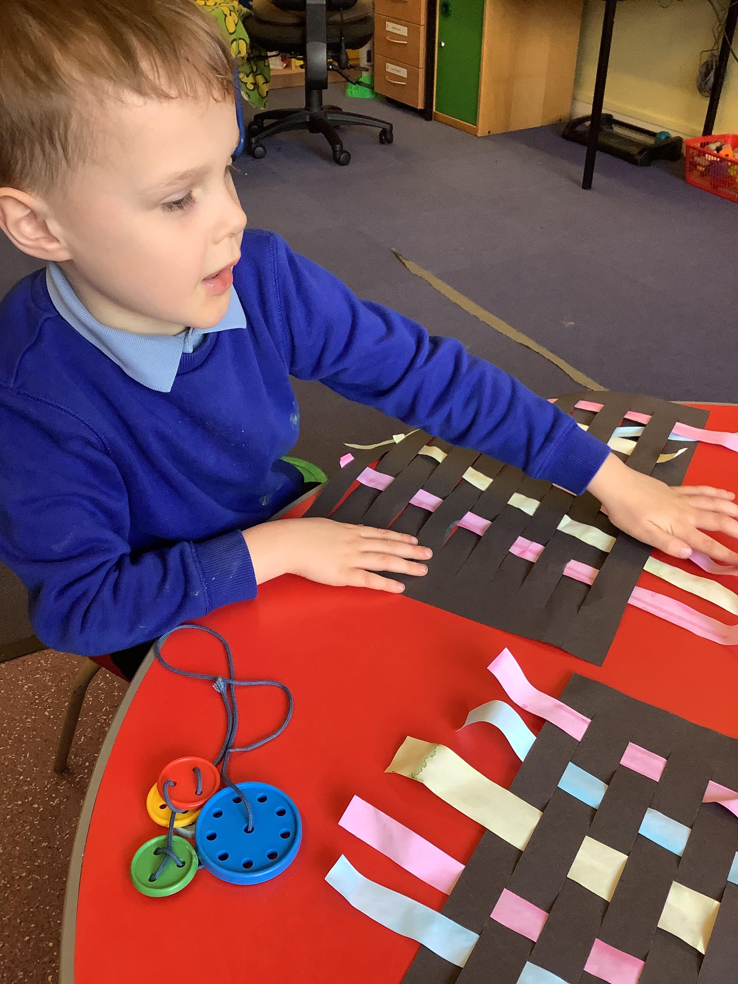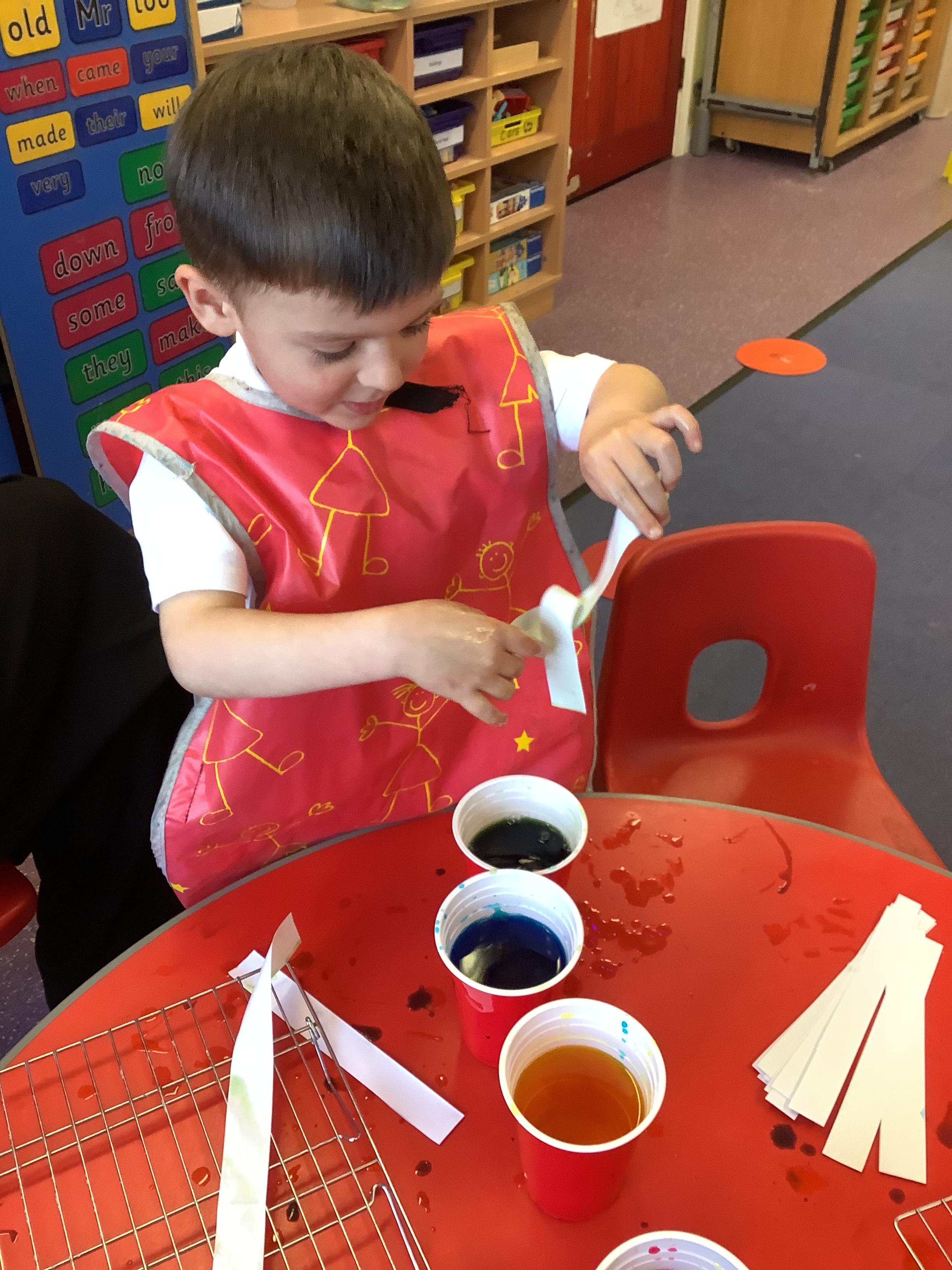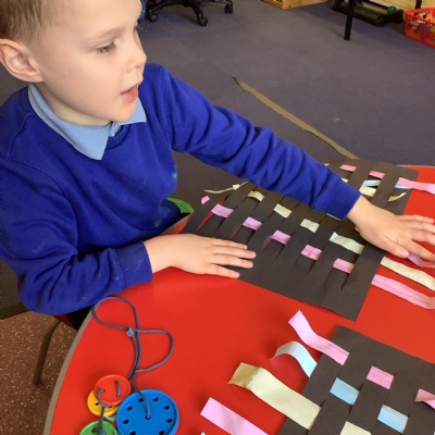 We have been paper weaving during our art lessons. The children enjoyed using the food colouring to dye the paper strip different colours and practiced the weaving method using thread first before practicing with paper.