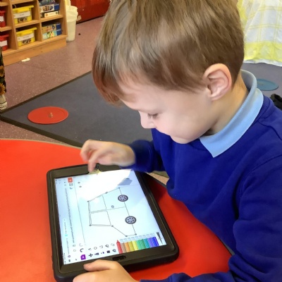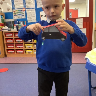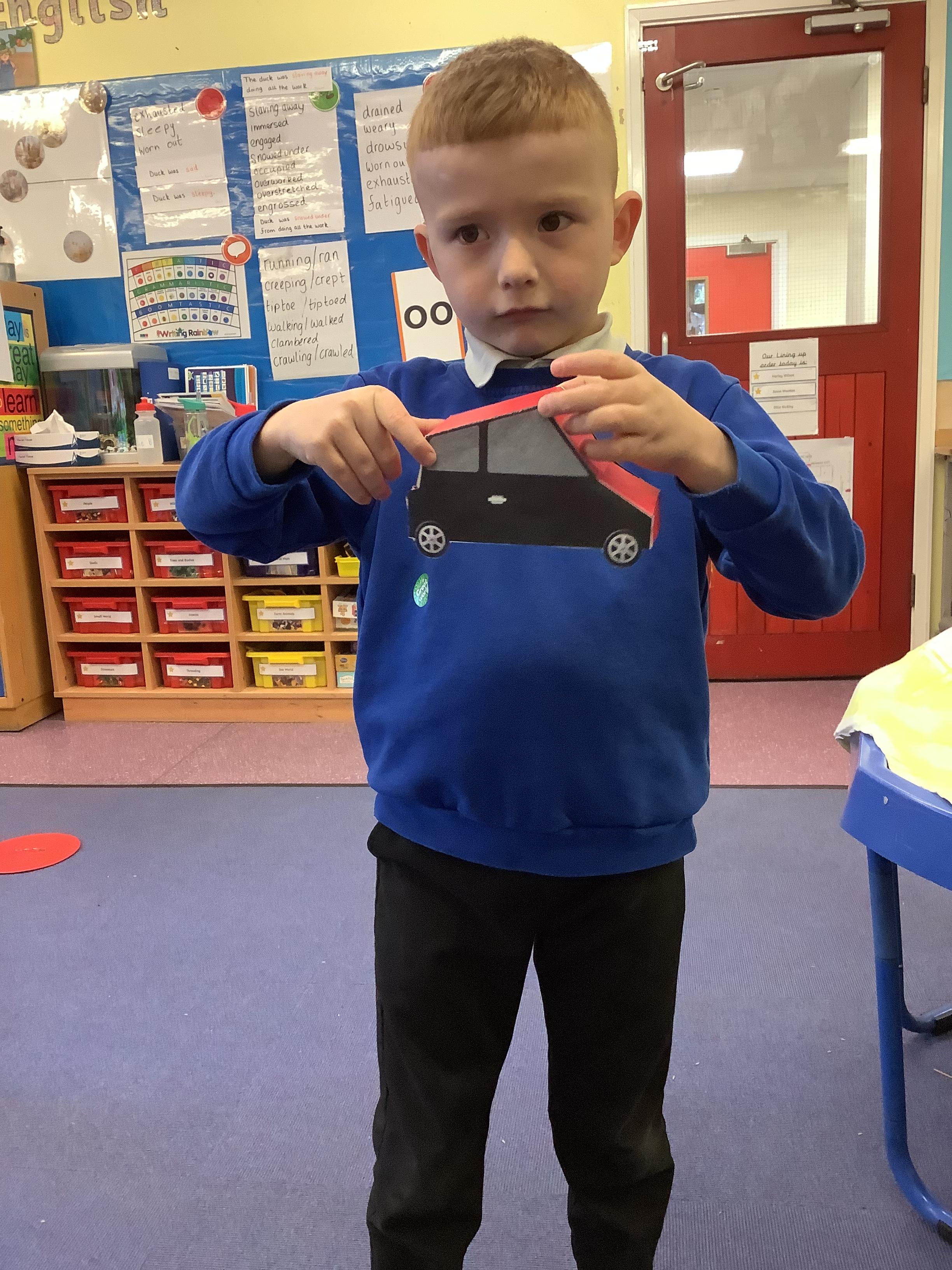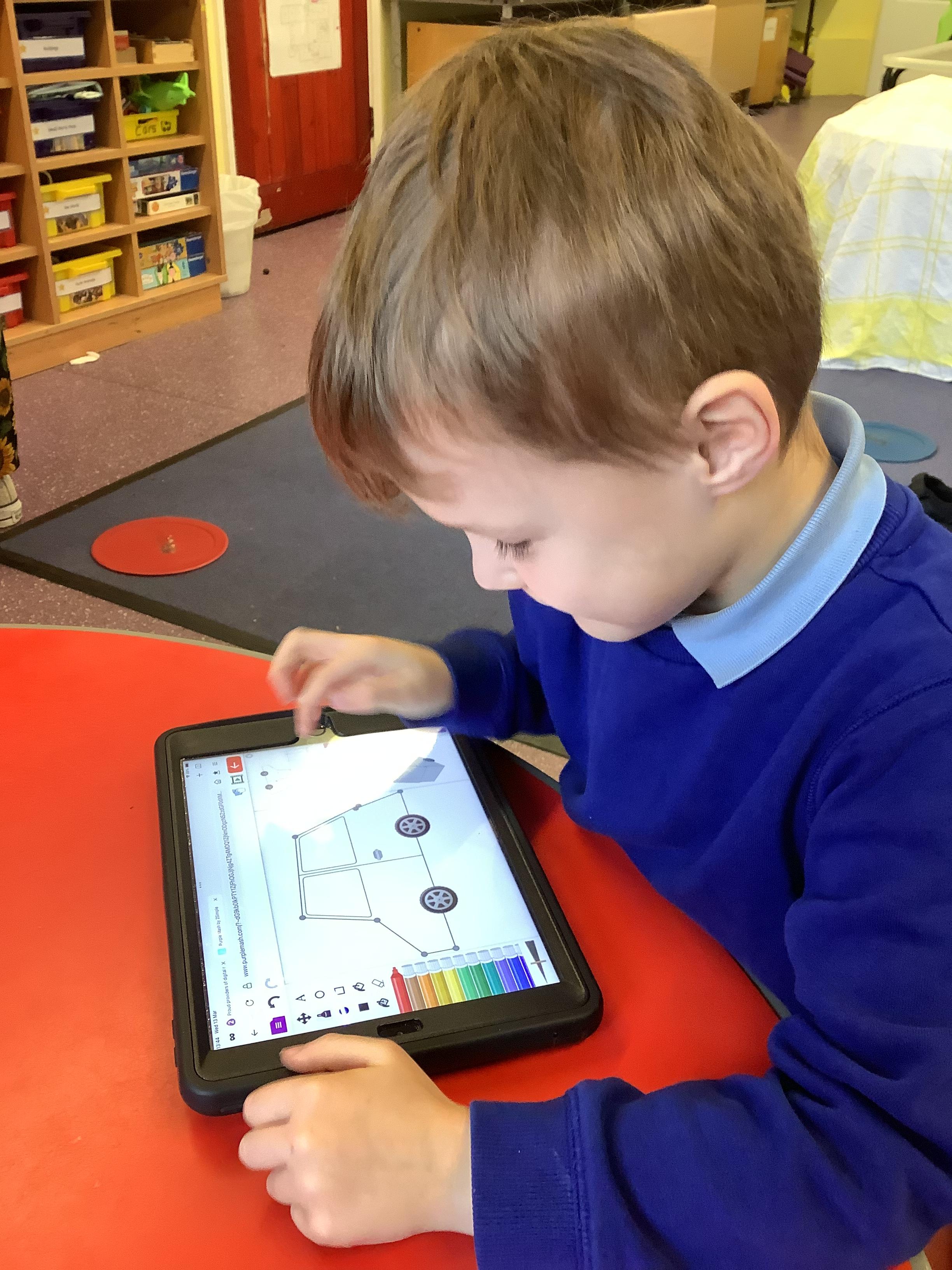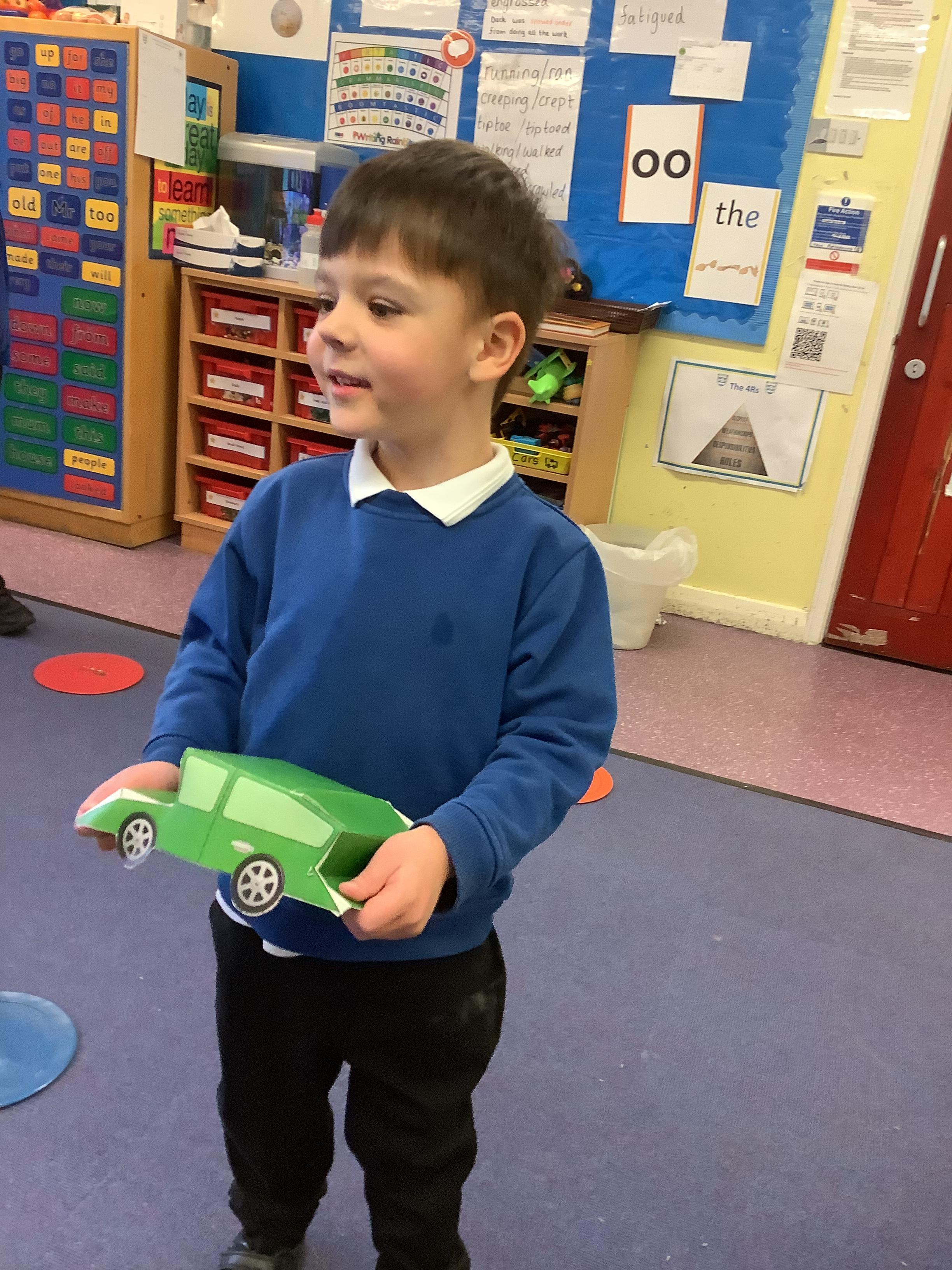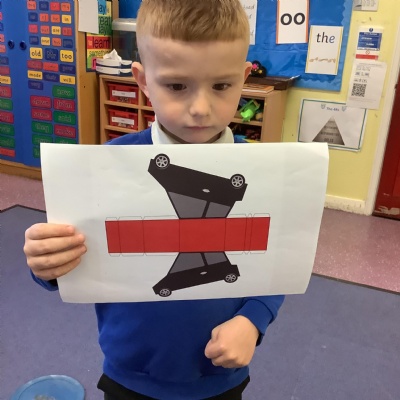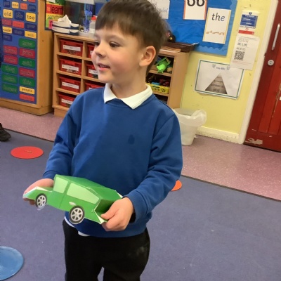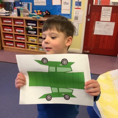 DT - We have been planning what we would like our cars to look like. We made cars using mobilo and then tried to recreate our designs using Purple Mash. We then made a net of our design and stuck this together to make our car shape.