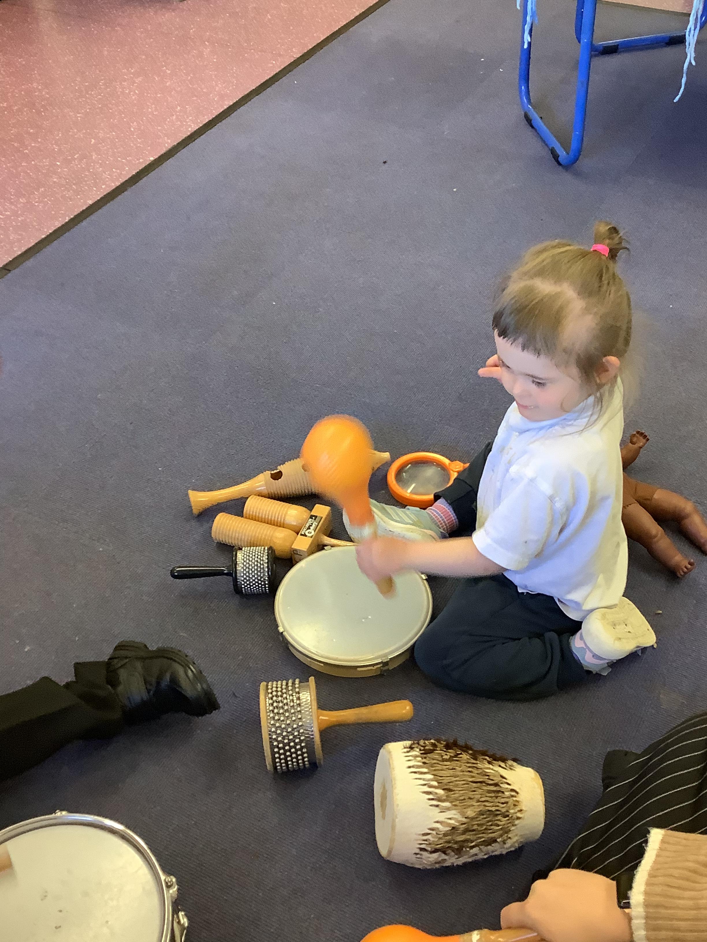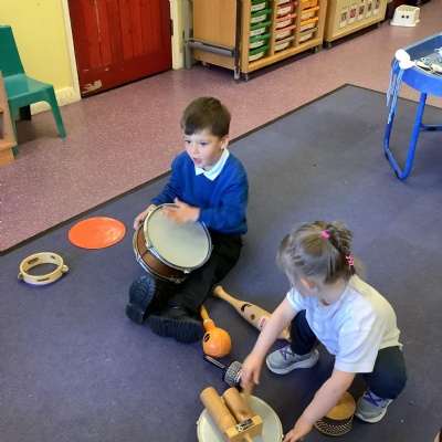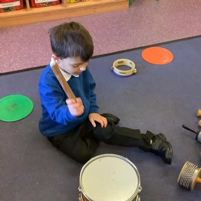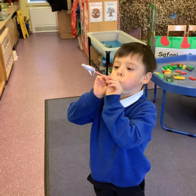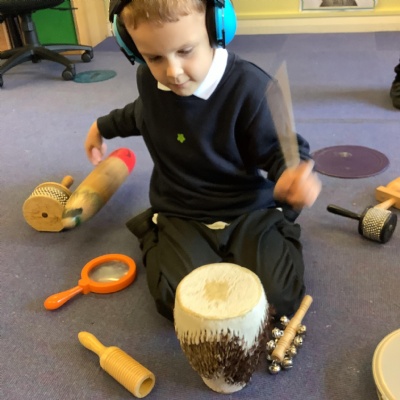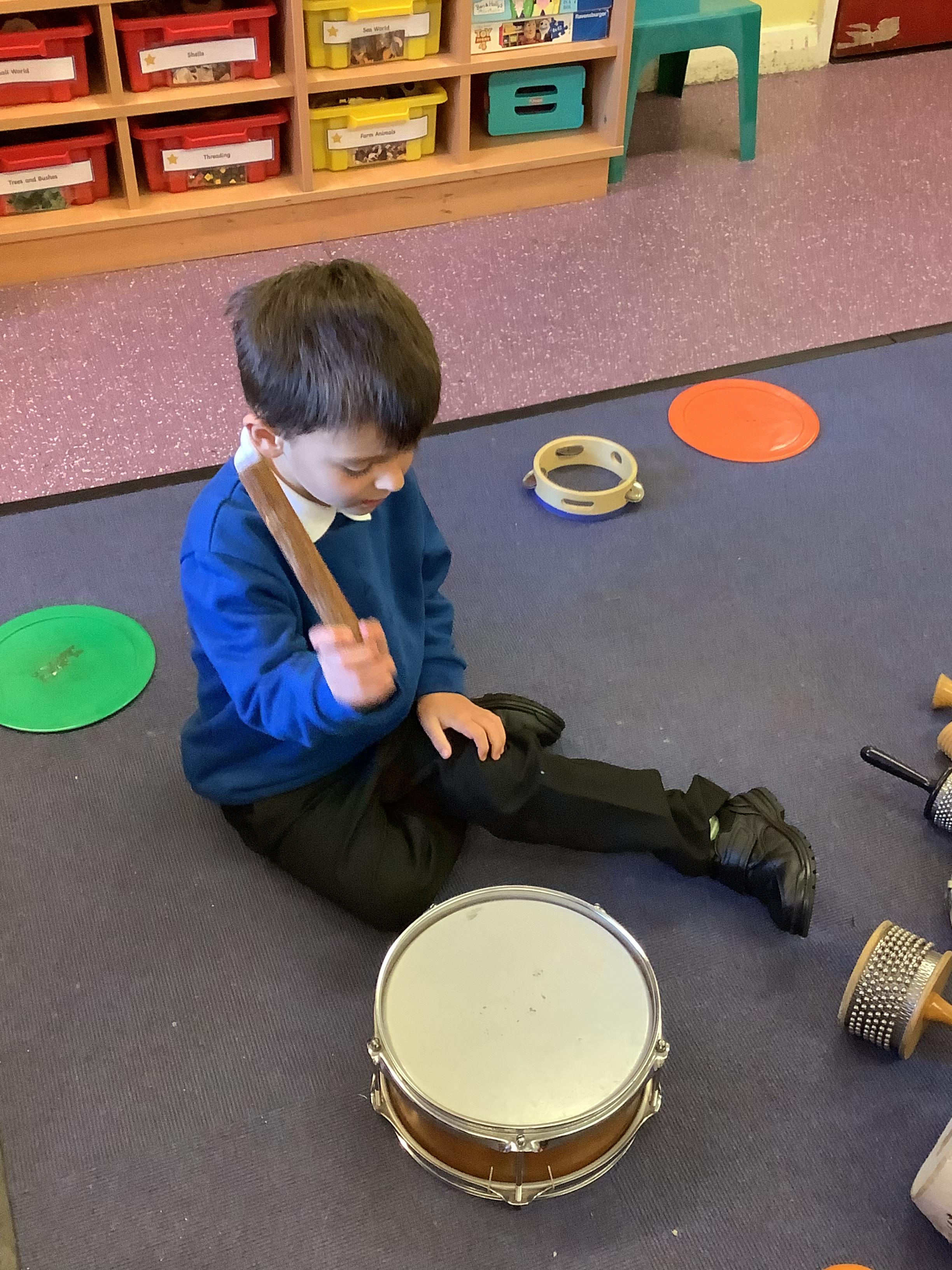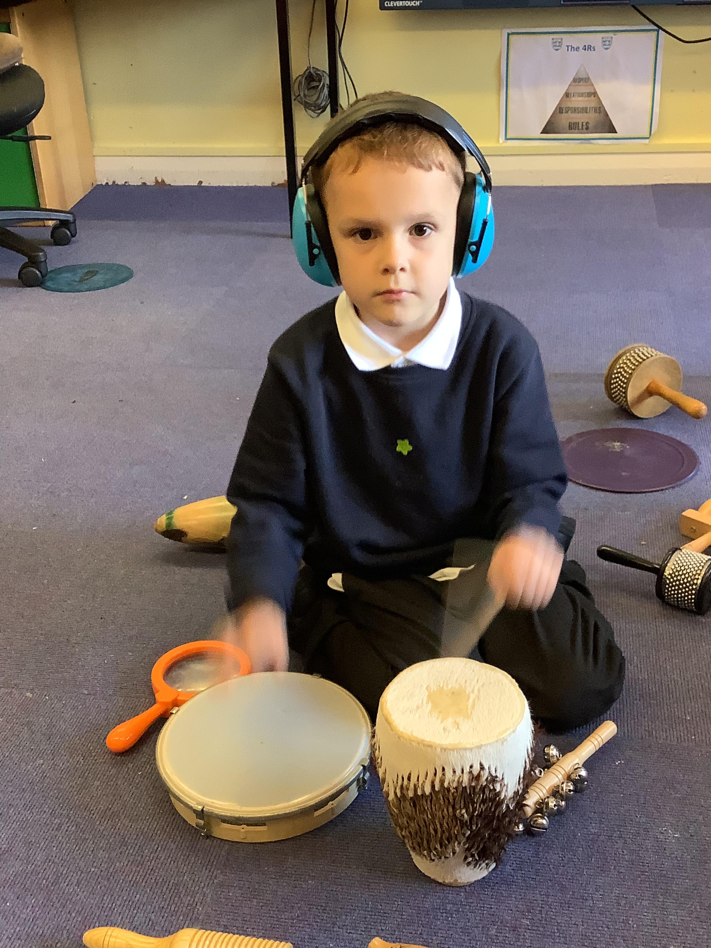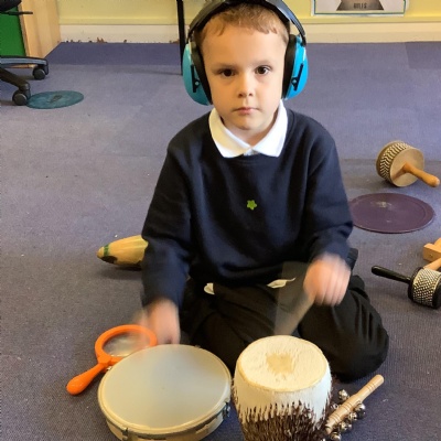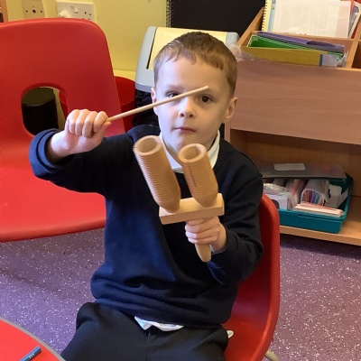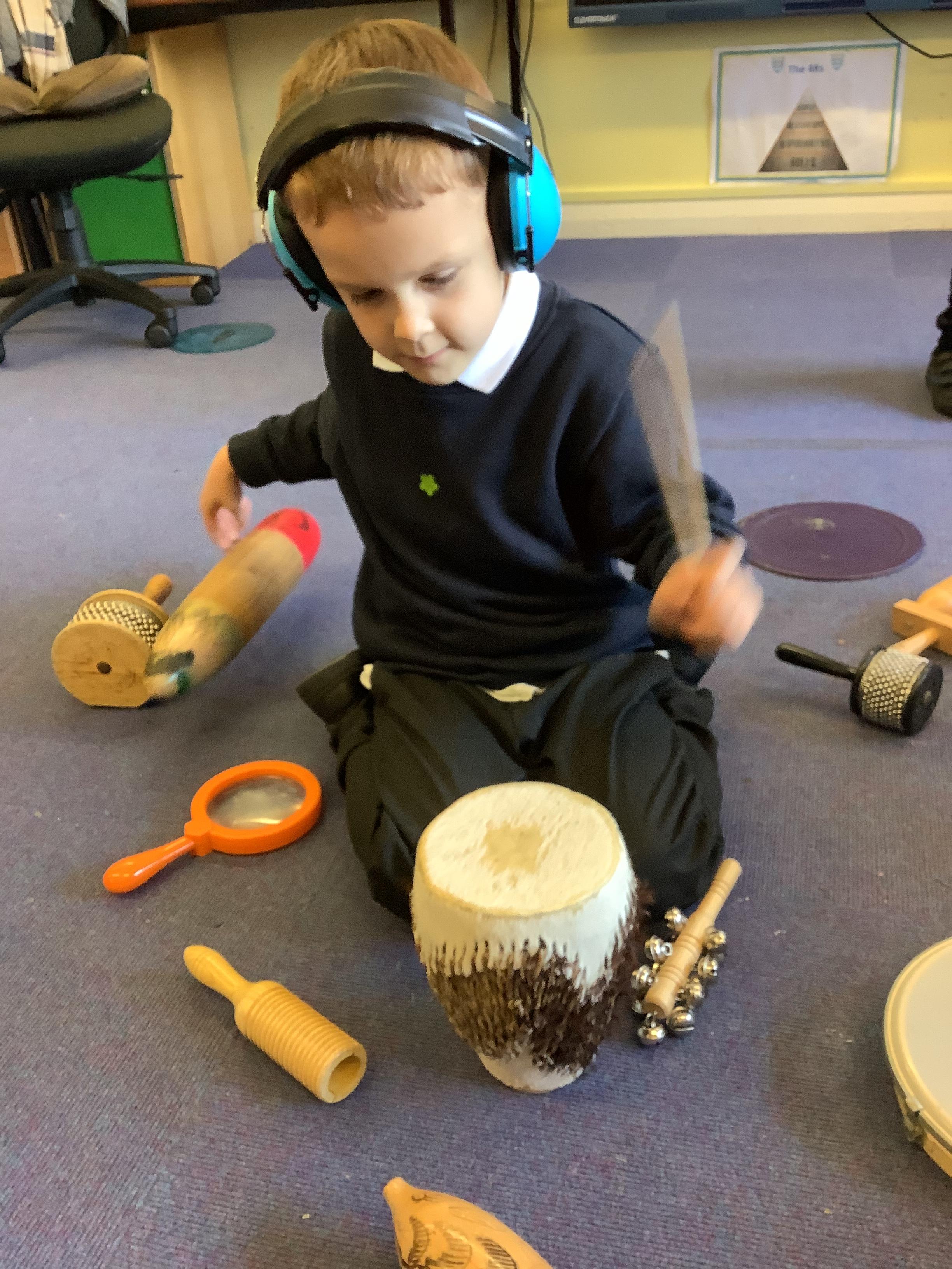 In science we have been discovering the basic parts of the human body. We have learned that our ears allow us to hear and tell which direction the sound is coming from. We also learnt that sound is made up of vibrations and we used our fingers to feel the vibrations we make when we hum. We then explored the different sounds that our instruments made and had a go at describing them using words from our vocabulary bank.