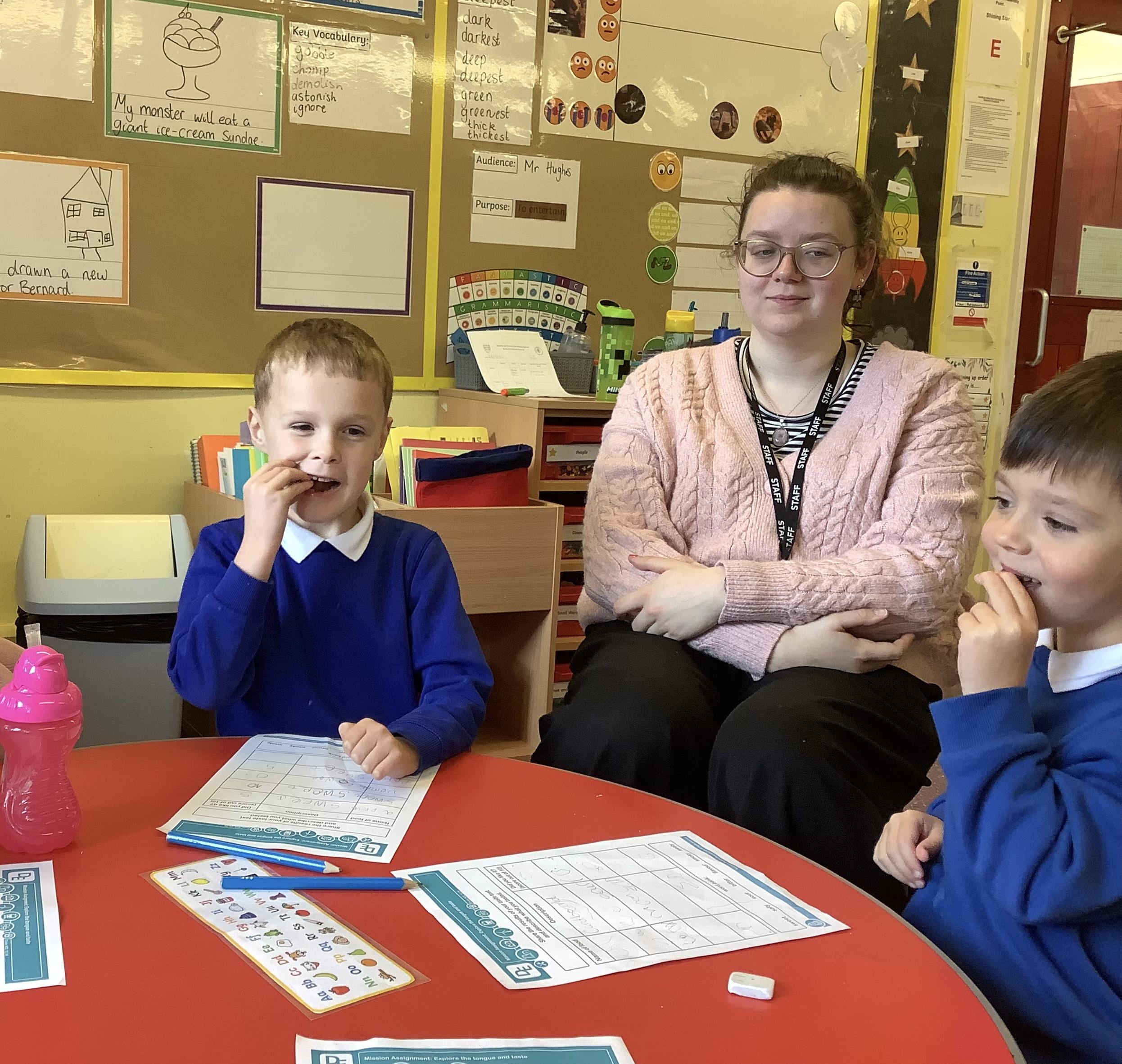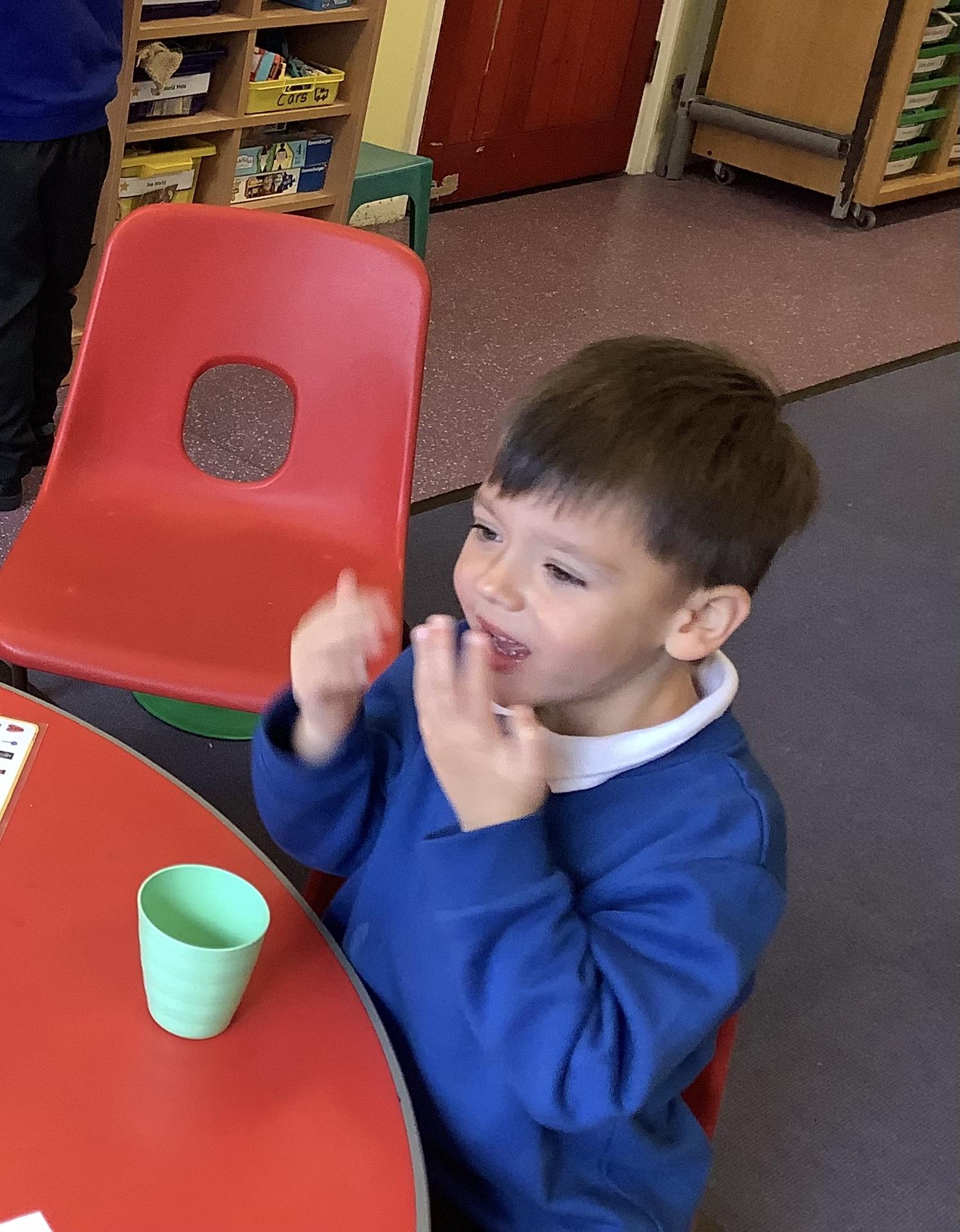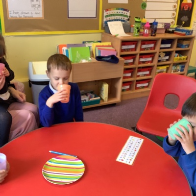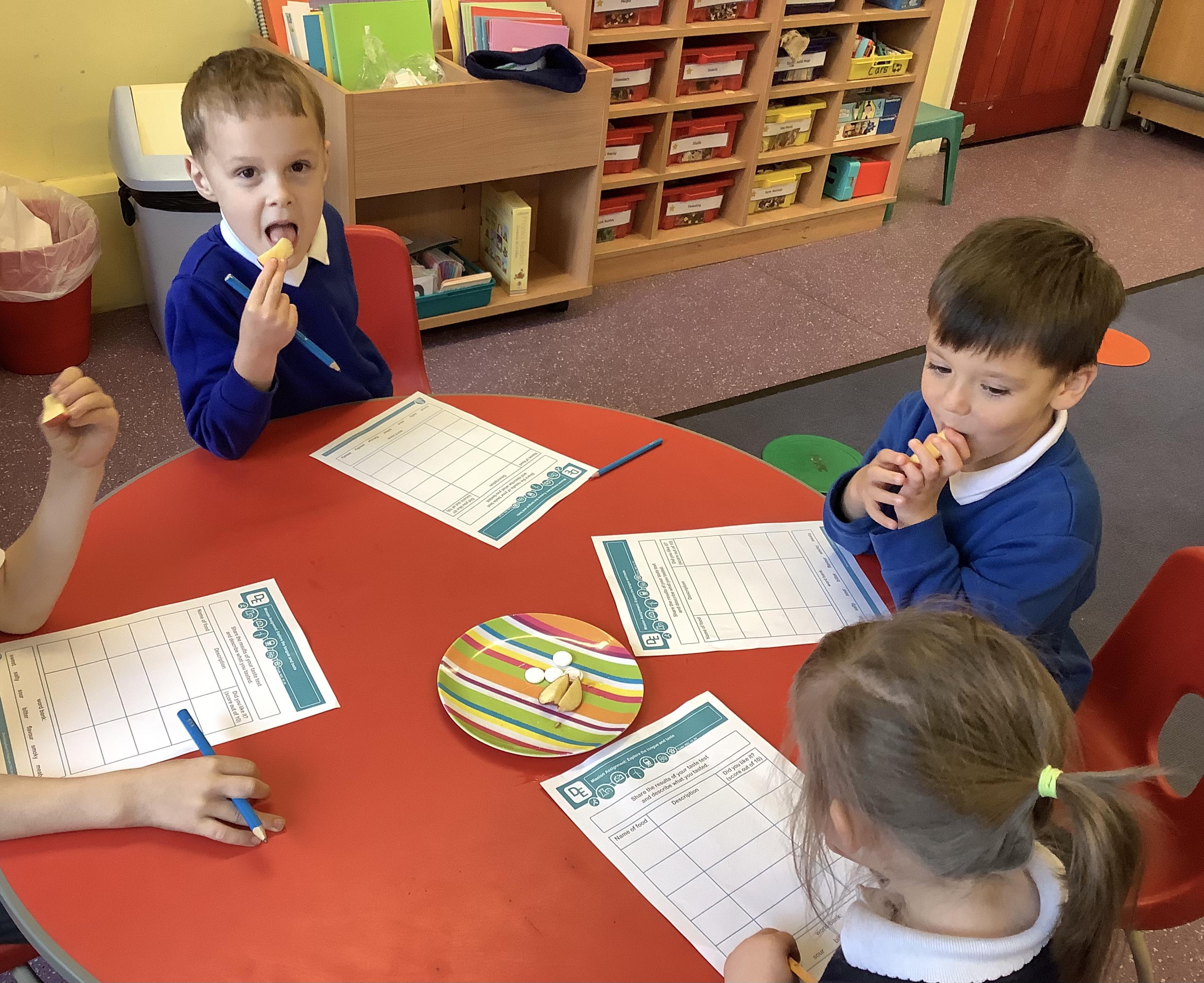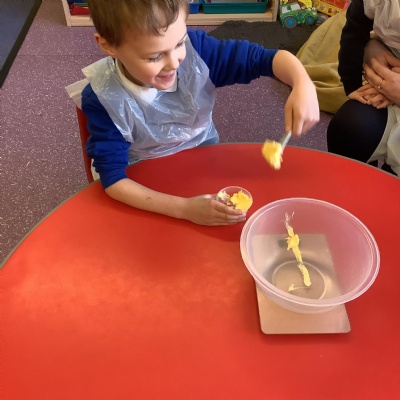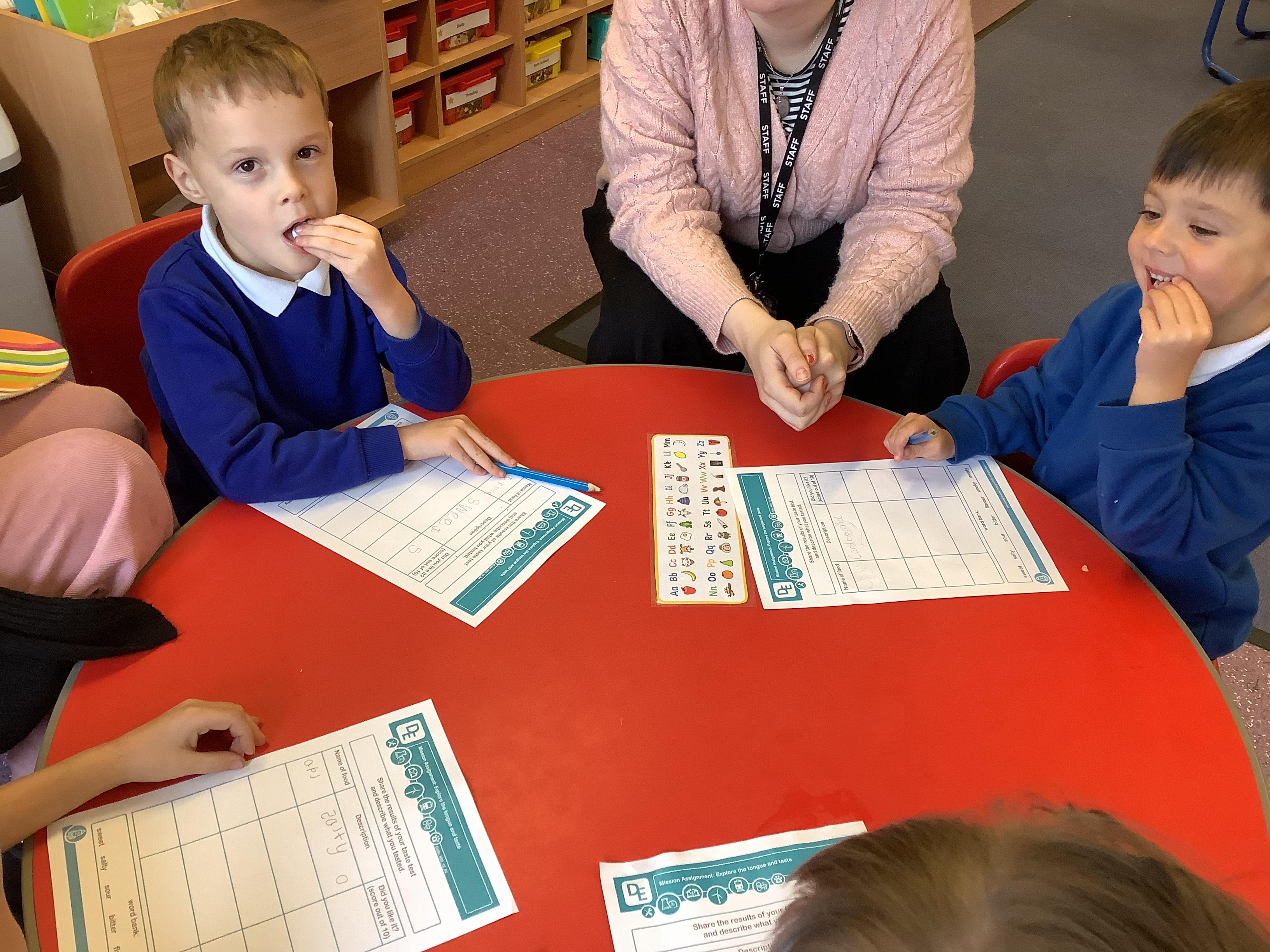We explored the tongue and taste next. We looked at our tongues and identified were our taste buds are. Our taste buds allow us to identify whether a flavour is sweet, salty, sour, bitter, or spicy and we explored this by tasting a range of flavours and describing how they tasted.