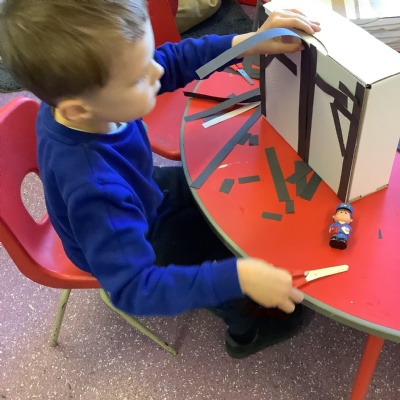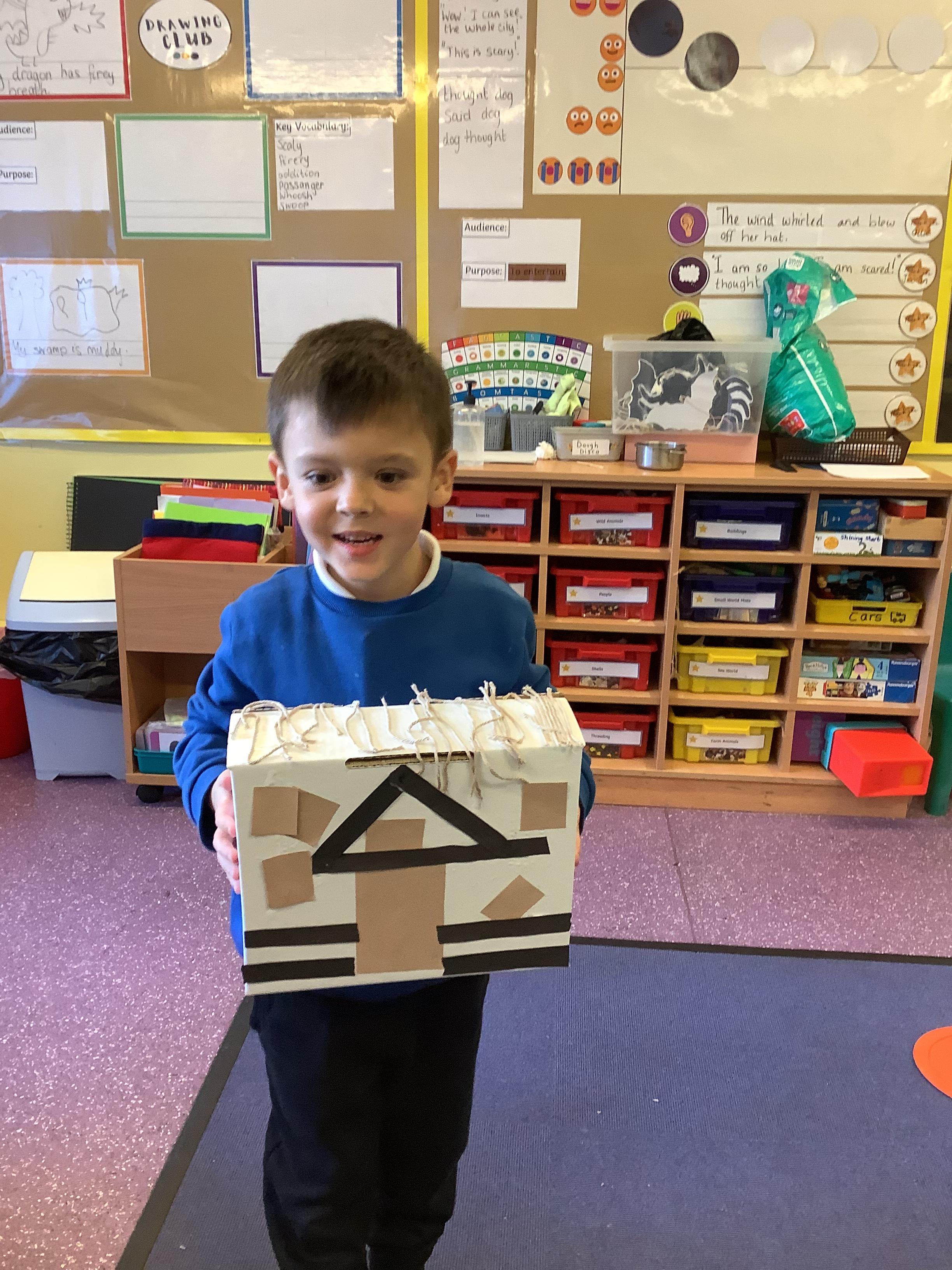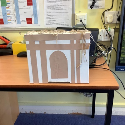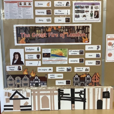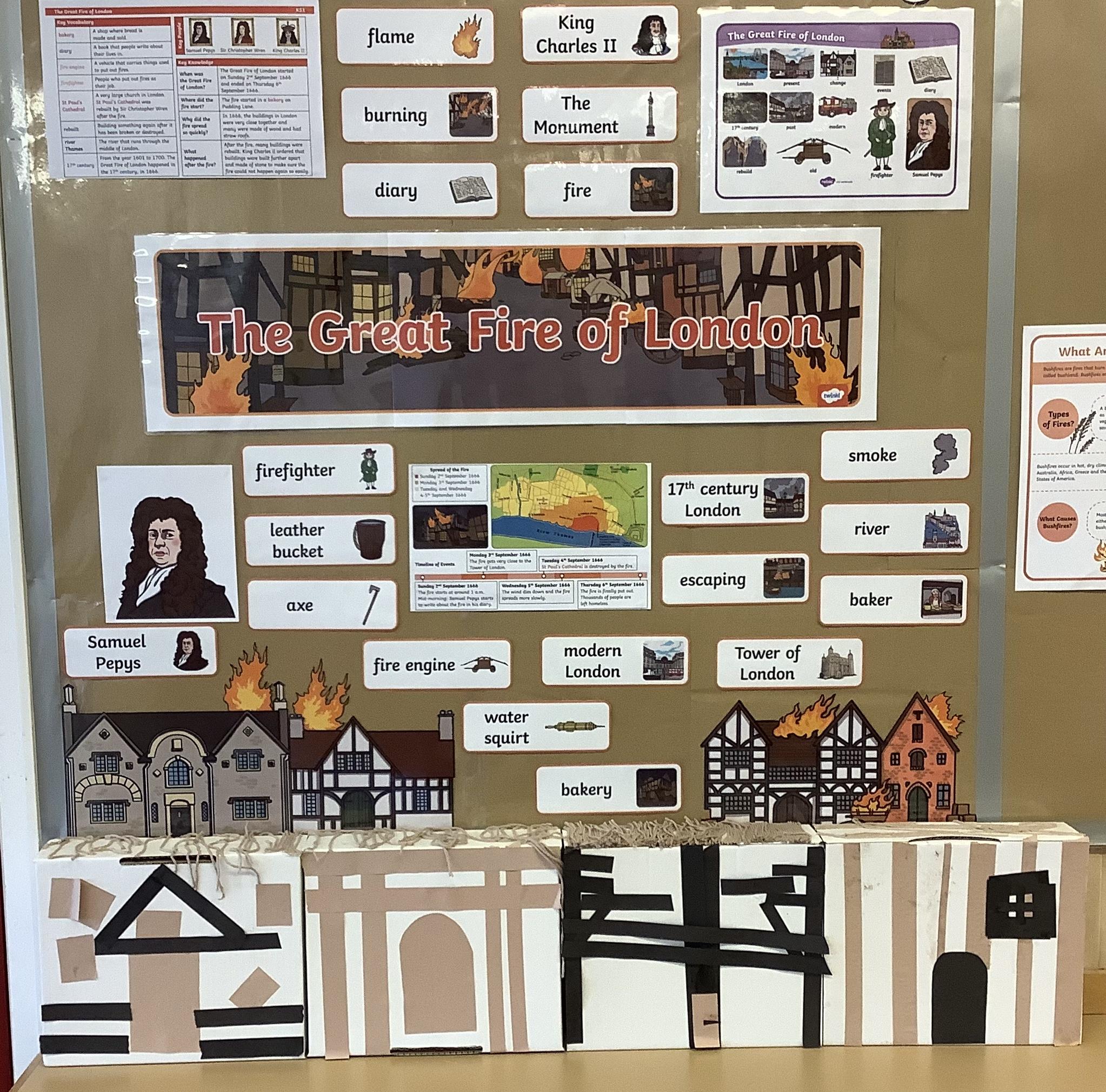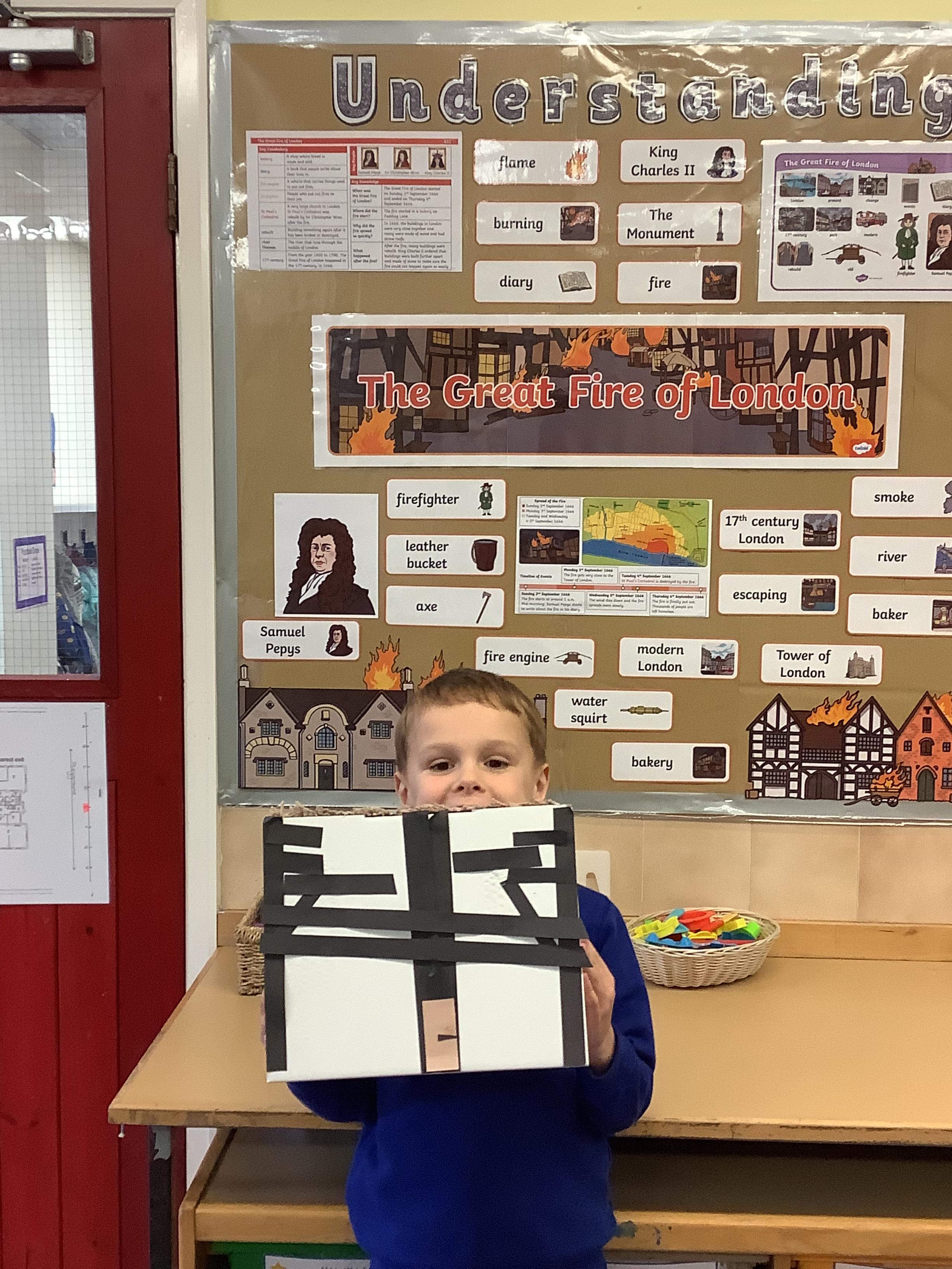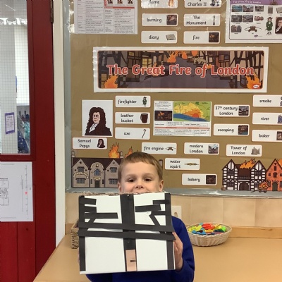 Look at our amazing Tudor houses! We built the houses to look like they did in the past around the time of ‘The Great Fire of London’ in 1666. We used wool to replicate the straw on the roof and we used strips of brown and black paper to replicate the wooden beams. We then put them close together to show how the fire spread so quickly.