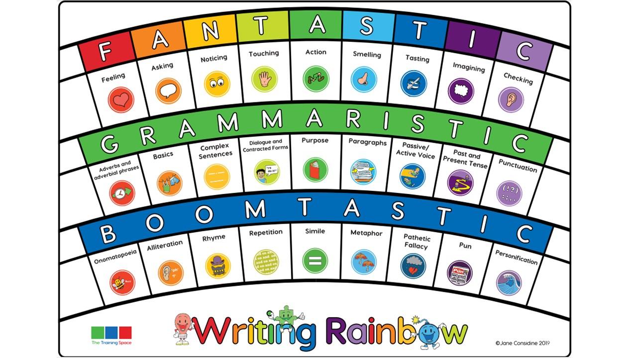 The writing process is underpinned by ‘The Writing Rainbow’: FANTASTICS, GRAMMARISTICS, BOOMBASTICS ‘lenses’ that embed grammar, writing techniques and ideas into every single lesson. The lenses give the children small, focused success criteria for each sentence they write, yet also supports children by giving them a starting point. The visual element of the approach, using the narrative map, poetry or non-fiction shapes, creates an inclusive scaffold for our SEND and EAL, while the lenses can be used to broaden and ‘Deepen the Moment’ for the more able.